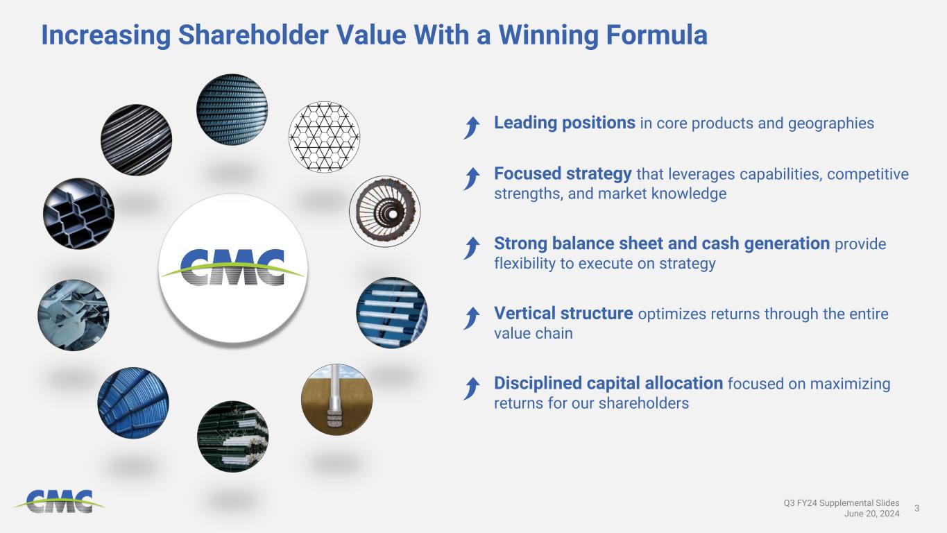 3Q3 FY24 Supplemental Slides June 20, 2024 Leading positions in core products and geographies Focused strategy that leverages capabilities, competitive strengths, and market knowledge Strong balance sheet and cash generation provide flexibility to execute on strategy Vertical structure optimizes returns through the entire value chain Disciplined capital allocation focused on maximizing returns for our shareholders Increasing Shareholder Value With a Winning Formula