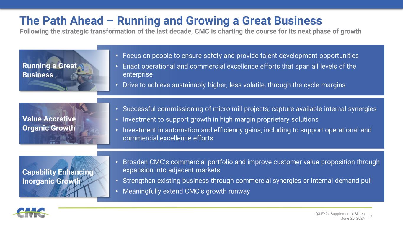 6 6% 10% 8% 9% 9% 12% 12% 17% 16% 13% – 2% 4% 6% 8% 10% 12% 14% 16% 18% 20% FY '15 FY '16 FY '17 FY '18 FY '19 FY '20 FY '21 FY '22 FY '23 FY '24 (YTD) • Strategic transformation has brought significant scale and earnings growth • Industry landscape has dramatically improved over the last five years • CMC has leveraged growth to generate higher, more sustainable margins • Margins are normalizing well above pre-pandemic levels • Returns on invested capital have been substantially above cost of capital • CMC is creating significant value for shareholders Structurally Improved Margins and Return Profile Q3 FY24 Supplemental Slides June 20, 2024 6% 5% 4% 9% 11% 12% 15% 26% 17% 11% – 5% 10% 15% 20% 25% 30% FY '15 FY '16 FY '17 FY '18 FY '19 FY '20 FY '21 FY '22 FY '23 Q3 '24 (L12M) % CMC Consolidated Core EBITDA Margin1 CMC Return on Invested Capital1 Normalizing above historical levels Normalizing above historical levels Margins and return levels are normalizing above historical levels [1] Core EBITDA margin and return on invested capital are non-GAAP financial measures. For definitions and reconciliations of non-GAAP financial measures to the most directly comparable GAAP financial measures, see the appendix to this document.