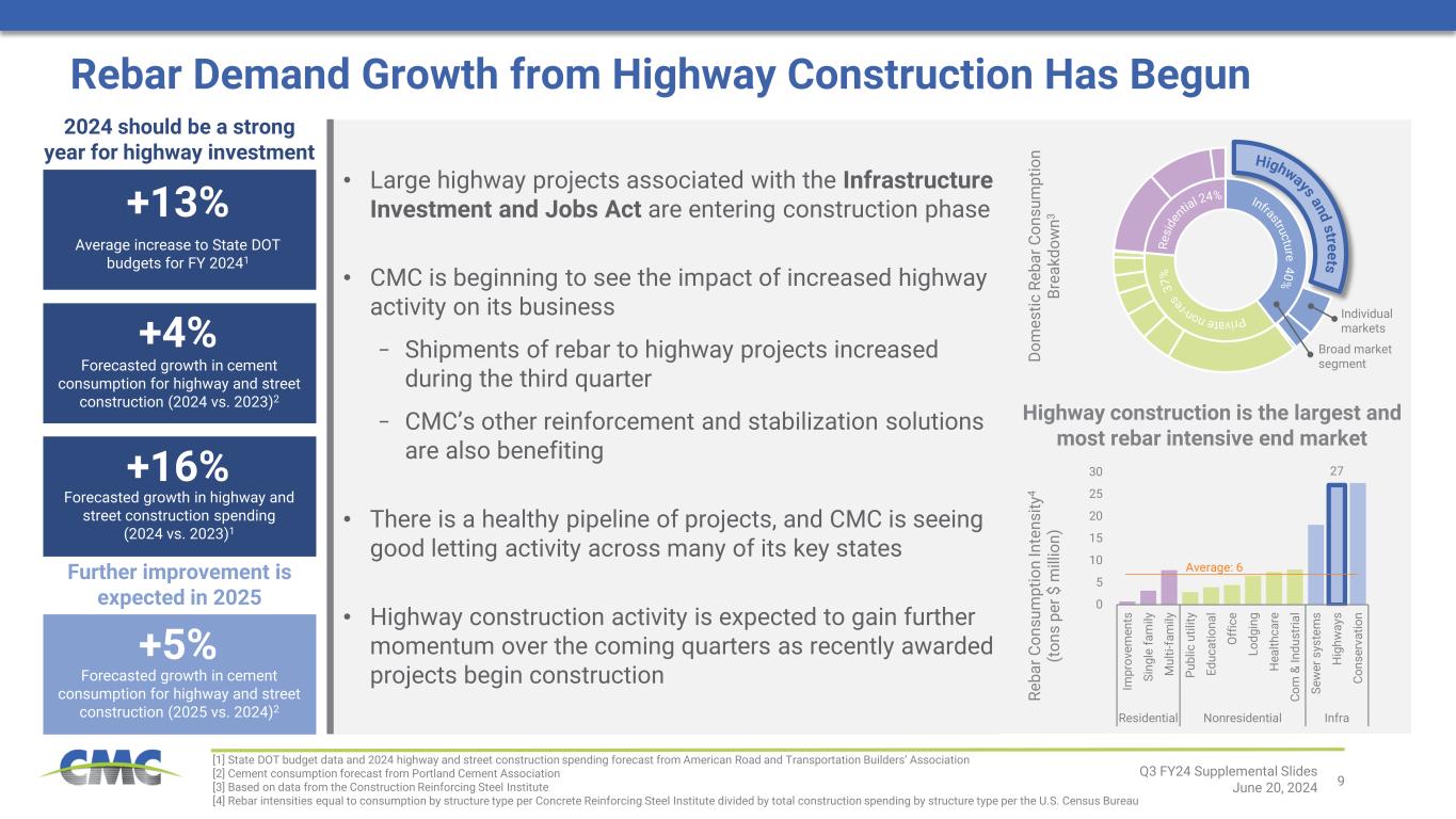 8 Forecasted Construction Starts – inflation adjusted (% change compared to average of 2019 to 20222) – 5% 10% 15% 20% 25% 2023 2024 2025 2026 – 10% 20% 30% 40% 50% 60% 70% 2023 2024 2025 2026 – 5% 10% 15% 20% 25% 30% 2023 2024 2025 2026 Estimated Potential Impact on Rebar Demand1 Government Support for Investment Structural Trends Expected to Support North American Construction RESHORING AND SUPPLY CHAIN REALIGNMENT ENERGY TRANSITION AND LNG INVESTMENTS Significant structural investment is expected to power domestic construction and rebar consumption over a multi-year period. In addition to direct investments, the follow-on indirect impact should also be meaningful as many large-scale projects will require local investments in infrastructure, non-residential structures, and residential dwellings. [1] Company estimates; potential increase to demand is at full run-rate of programs and relative to current annual domestic demand of ~9 million tons [2] Dodge Analytics Construction Starts Forecast – Q2 2024 Edition INFRASTRUCTURE INVESTMENT $550B from Infrastructure Investment and Jobs Act $52B CHIPS Act $250B Inflation Reduction Act $12B DOE loans Funding from IRA Q3 FY24 Supplemental Slides June 20, 2024 +15% to 17% +3% to 5% +2% to 4% Public Works Manufacturing Power & Utilities