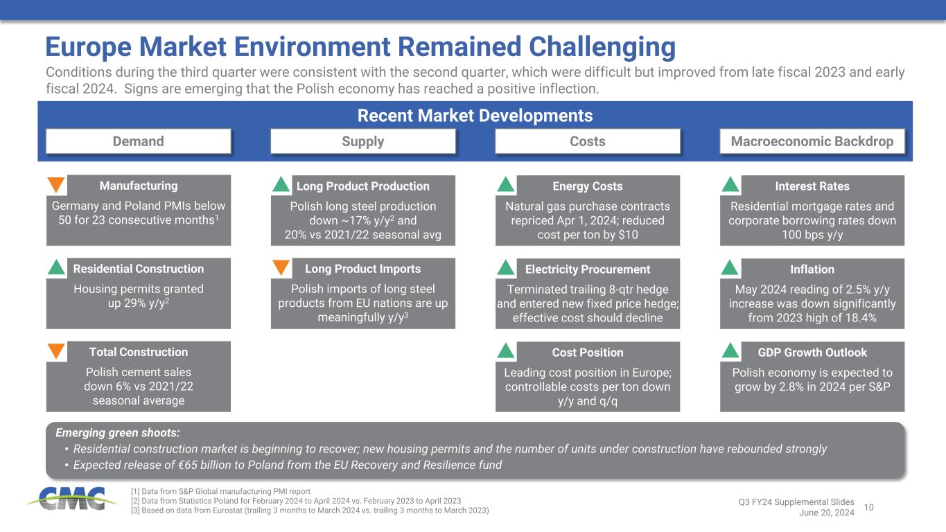 9 Individual markets Broad market segmentDo m es tic R eb ar C on su m pt io n Br ea kd ow n3 Rebar Demand Growth from Highway Construction Has Begun Q3 FY24 Supplemental Slides June 20, 2024 27 0 5 10 15 20 25 30 Im pr ov em en ts Si ng le fa m ily M ul ti- fa m ily Pu bl ic u til ity Ed uc at io na l O ff ic e Lo dg in g H ea lth ca re Co m & In du st ria l Se w er s ys te m s H ig hw ay s Co ns er va tio n Residential Nonresidential Infra Re ba r C on su m pt io n In te ns ity 4 (t on s pe r $ m ill io n) Average: 6 +13% Average increase to State DOT budgets for FY 20241 +4% Forecasted growth in cement consumption for highway and street construction (2024 vs. 2023)2 +16% Forecasted growth in highway and street construction spending (2024 vs. 2023)1 Highway construction is the largest and most rebar intensive end market +5% Forecasted growth in cement consumption for highway and street construction (2025 vs. 2024)2 2024 should be a strong year for highway investment • Large highway projects associated with the Infrastructure Investment and Jobs Act are entering construction phase • CMC is beginning to see the impact of increased highway activity on its business − Shipments of rebar to highway projects increased during the third quarter − CMC’s other reinforcement and stabilization solutions are also benefiting • There is a healthy pipeline of projects, and CMC is seeing good letting activity across many of its key states • Highway construction activity is expected to gain further momentum over the coming quarters as recently awarded projects begin construction Further improvement is expected in 2025 [1] State DOT budget data and 2024 highway and street construction spending forecast from American Road and Transportation Builders’ Association [2] Cement consumption forecast from Portland Cement Association [3] Based on data from the Construction Reinforcing Steel Institute [4] Rebar intensities equal to consumption by structure type per Concrete Reinforcing Steel Institute divided by total construction spending by structure type per the U.S. Census Bureau