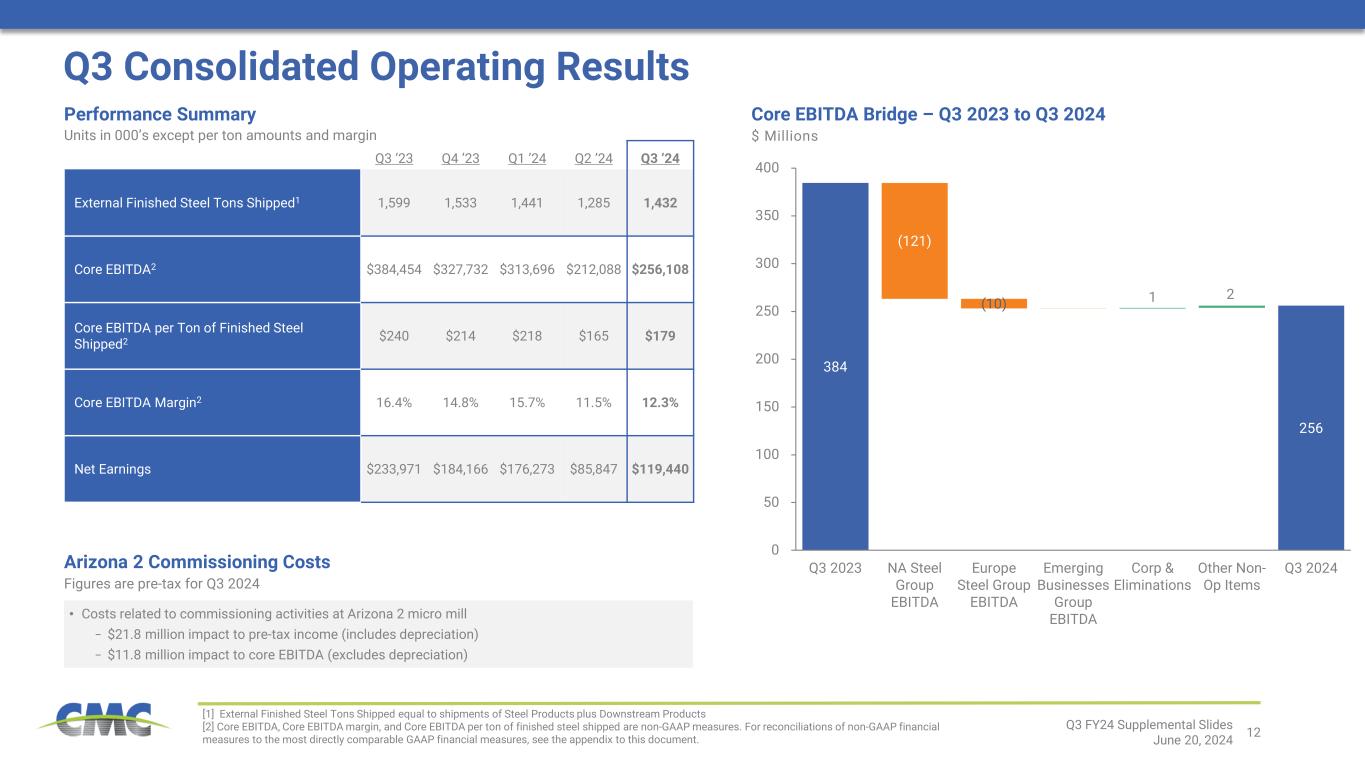 11 • Consolidated financial results in the fourth quarter are anticipated to be similar to third quarter levels • North America Steel Group finished steel shipments should be flat on a sequential basis, while adjusted EBITDA margin is also expected to be stable • Europe Steel Group adjusted EBITDA in the fourth quarter is expected to continue to trend toward near breakeven • Modest improvement in financial results is expected for Emerging Businesses Group, driven by steady underlying market fundamentals and a healthy order book • Demand conditions in North America remained supportive with normal seasonal uplift from winter to spring months − Finished steel shipments decreased 3.0% y/y, while rebar shipments (mill direct rebar and downstream) declined 3.3% from the prior year period • North America Steel Group steel product margin improved sequentially with steel price declining less than scrap cost − Steel product margin declined $57 per ton from the prior year period • Downstream product margins over scrap1 remained well above historical levels, but declined $155 per ton from the prior year period • North America Steel Group controllable costs per ton decreased on y/y basis − Adjusted EBITDA in third quarter of fiscal 2024 included $11.8 million related to Arizona 2 commissioning costs compared to $7.3 million during the third quarter of fiscal 2023 • Market conditions for the Europe Steel Group were stable compared to the prior quarter, but remained challenging – domestic producers continue to demonstrate supply discipline − Steel product margins over scrap cost increased by $13 per ton from the sequential quarter − Shipments increased by 8% from the sequential quarter • Emerging Businesses Group net sales and adjusted EBITDA margin were flat y/y − Positive impacts from the addition of CMC Anchoring Systems, strong geogrid demand, and increased shipments of proprietary reinforcing steel products were largely offset by weather related slowness at Texas-centric CMC Construction Services. Pe rf or m an ce D riv er s O ut lo ok Q3 Operational Update [1] Downstream Product Margin Over Scrap equals Average Selling Price minus cost of ferrous scrap utilized during the prior quarter Q3 FY24 Supplemental Slides June 20, 2024