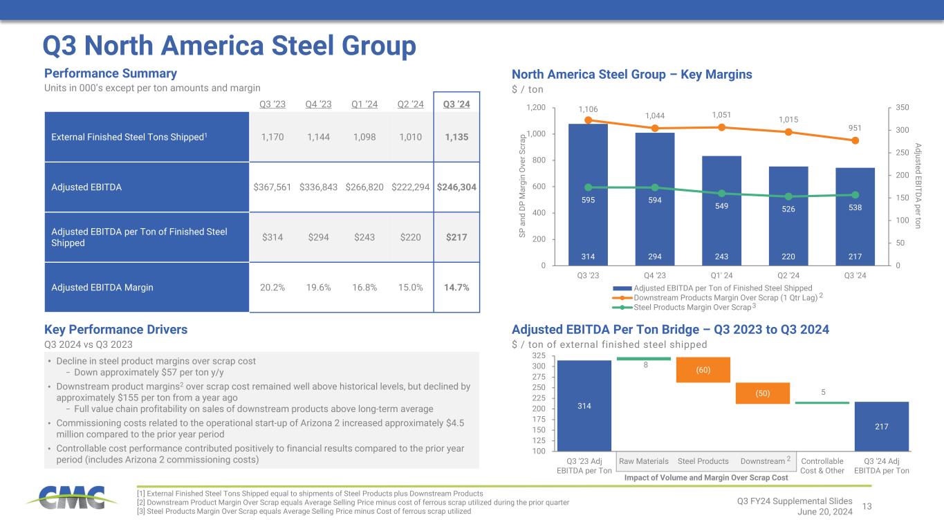12 384 256 (121) (10) 1 2 0 50 100 150 200 250 300 350 400 Q3 2023 NA Steel Group EBITDA Europe Steel Group EBITDA Emerging Businesses Group EBITDA Corp & Eliminations Other Non- Op Items Q3 2024 Q3 Consolidated Operating Results Q3 ’23 Q4 ’23 Q1 ’24 Q2 ’24 Q3 ’24 External Finished Steel Tons Shipped1 1,599 1,533 1,441 1,285 1,432 Core EBITDA2 $384,454 $327,732 $313,696 $212,088 $256,108 Core EBITDA per Ton of Finished Steel Shipped2 $240 $214 $218 $165 $179 Core EBITDA Margin2 16.4% 14.8% 15.7% 11.5% 12.3% Net Earnings $233,971 $184,166 $176,273 $85,847 $119,440 Performance Summary Units in 000’s except per ton amounts and margin • Costs related to commissioning activities at Arizona 2 micro mill − $21.8 million impact to pre-tax income (includes depreciation) − $11.8 million impact to core EBITDA (excludes depreciation) Arizona 2 Commissioning Costs Figures are pre-tax for Q3 2024 [1] External Finished Steel Tons Shipped equal to shipments of Steel Products plus Downstream Products [2] Core EBITDA, Core EBITDA margin, and Core EBITDA per ton of finished steel shipped are non-GAAP measures. For reconciliations of non-GAAP financial measures to the most directly comparable GAAP financial measures, see the appendix to this document. Core EBITDA Bridge – Q3 2023 to Q3 2024 $ Millions Q3 FY24 Supplemental Slides June 20, 2024
