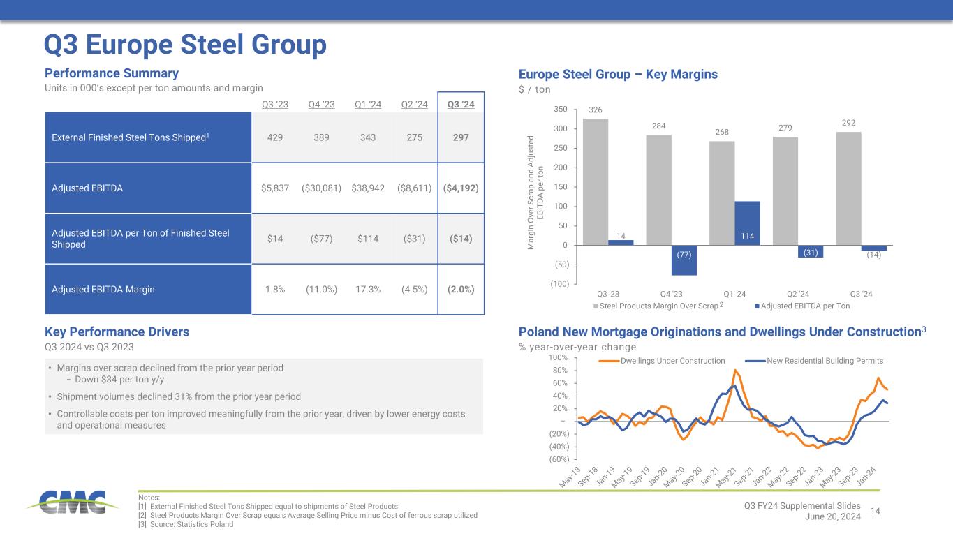14 (60%) (40%) (20%) – 20% 40% 60% 80% 100% Dwellings Under Construction New Residential Building Permits 326 284 268 279 292 14 (77) 114 (31) (14) (100) (50) 0 50 100 150 200 250 300 350 Q3 '23 Q4 '23 Q1' 24 Q2 '24 Q3 '24 Steel Products Margin Over Scrap Adjusted EBITDA per Ton Key Performance Drivers Q3 2024 vs Q3 2023 Q3 Europe Steel Group Q3 ’23 Q4 ’23 Q1 ’24 Q2 ’24 Q3 ’24 External Finished Steel Tons Shipped1 429 389 343 275 297 Adjusted EBITDA $5,837 ($30,081) $38,942 ($8,611) ($4,192) Adjusted EBITDA per Ton of Finished Steel Shipped $14 ($77) $114 ($31) ($14) Adjusted EBITDA Margin 1.8% (11.0%) 17.3% (4.5%) (2.0%) Performance Summary Units in 000’s except per ton amounts and margin • Margins over scrap declined from the prior year period − Down $34 per ton y/y • Shipment volumes declined 31% from the prior year period • Controllable costs per ton improved meaningfully from the prior year, driven by lower energy costs and operational measures Europe Steel Group – Key Margins $ / ton Poland New Mortgage Originations and Dwellings Under Construction3 % year-over-year change 2 Notes: [1] External Finished Steel Tons Shipped equal to shipments of Steel Products [2] Steel Products Margin Over Scrap equals Average Selling Price minus Cost of ferrous scrap utilized [3] Source: Statistics Poland M ar gi n O ve r S cr ap a nd A dj us te d EB IT DA p er to n Q3 FY24 Supplemental Slides June 20, 2024