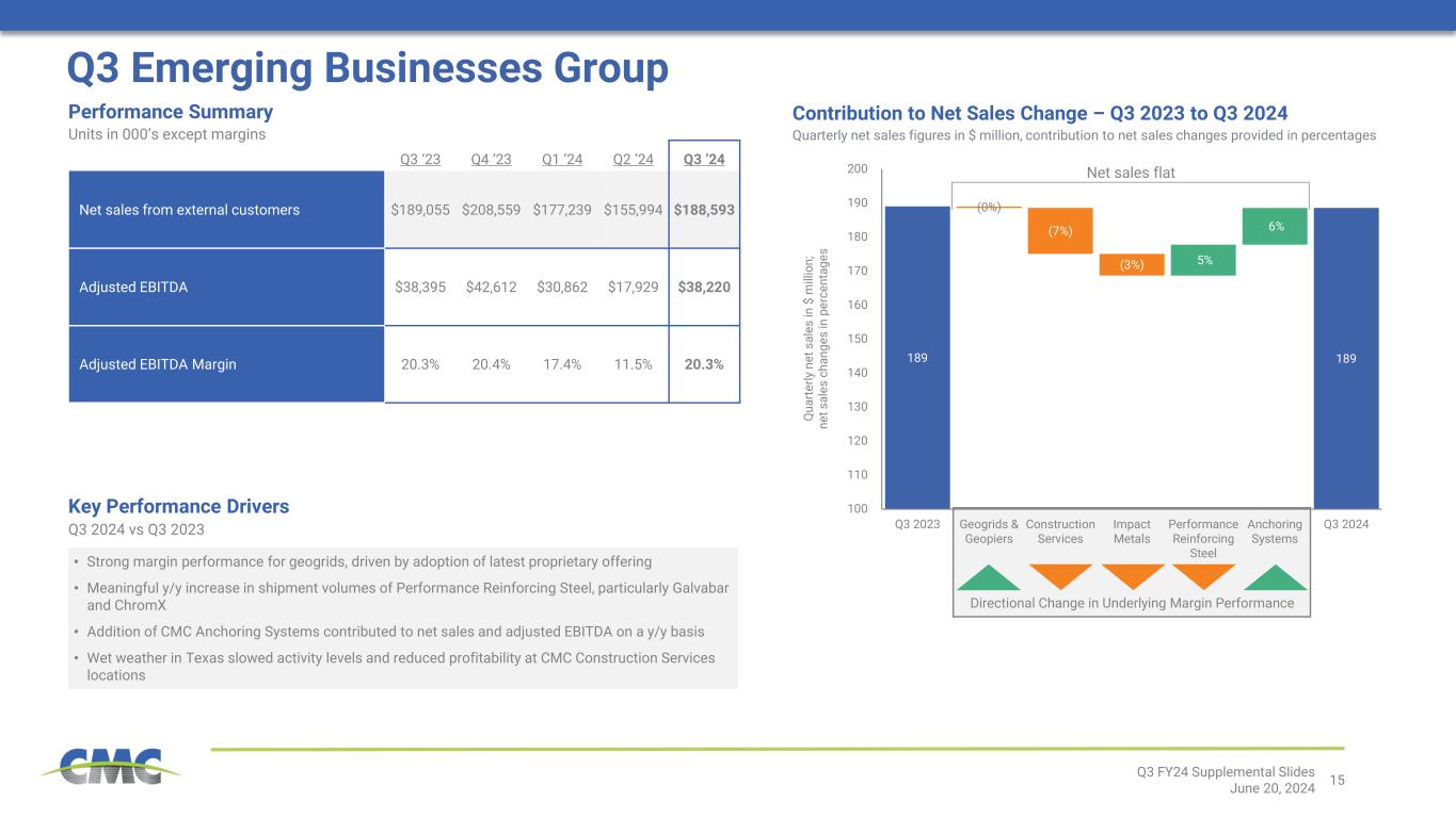 15 189 189 (0%) (7%) (3%) 5% 6% 100 110 120 130 140 150 160 170 180 190 200 Q3 2023 Geogrids & Geopiers Construction Services Impact Metals Performance Reinforcing Steel Anchoring Systems Q3 2024 Key Performance Drivers Q3 2024 vs Q3 2023 Q3 Emerging Businesses Group Q3 ’23 Q4 ’23 Q1 ’24 Q2 ’24 Q3 ’24 Net sales from external customers $189,055 $208,559 $177,239 $155,994 $188,593 Adjusted EBITDA $38,395 $42,612 $30,862 $17,929 $38,220 Adjusted EBITDA Margin 20.3% 20.4% 17.4% 11.5% 20.3% Performance Summary Units in 000’s except margins • Strong margin performance for geogrids, driven by adoption of latest proprietary offering • Meaningful y/y increase in shipment volumes of Performance Reinforcing Steel, particularly Galvabar and ChromX • Addition of CMC Anchoring Systems contributed to net sales and adjusted EBITDA on a y/y basis • Wet weather in Texas slowed activity levels and reduced profitability at CMC Construction Services locations Contribution to Net Sales Change – Q3 2023 to Q3 2024 Quarterly net sales figures in $ million, contribution to net sales changes provided in percentages Q3 FY24 Supplemental Slides June 20, 2024 Q ua rt er ly n et s al es in $ m ill io n; ne t s al es c ha ng es in p er ce nt ag es Net sales flat Directional Change in Underlying Margin Performance