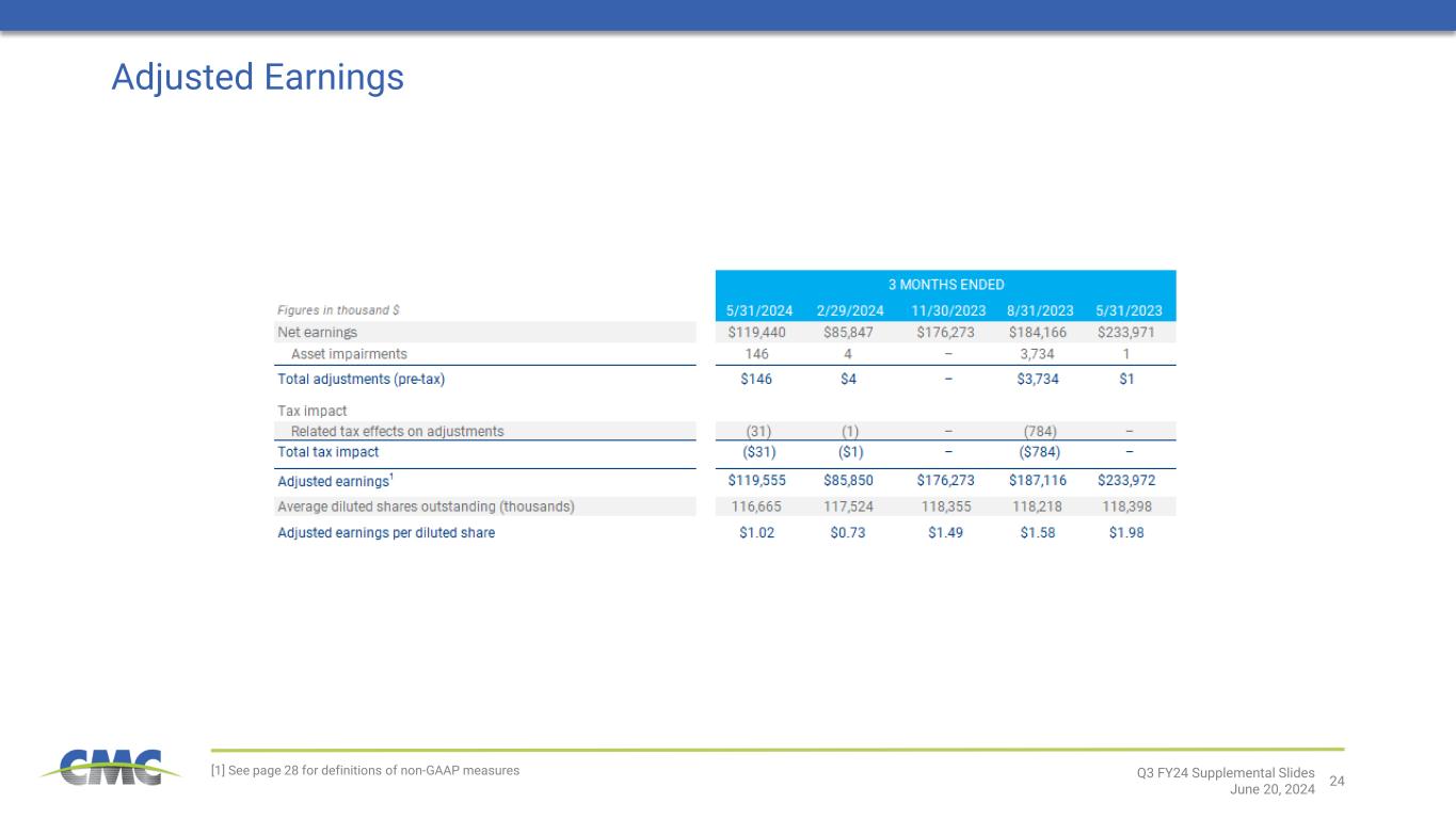 24 Adjusted Earnings [1] See page 28 for definitions of non-GAAP measures Q3 FY24 Supplemental Slides June 20, 2024