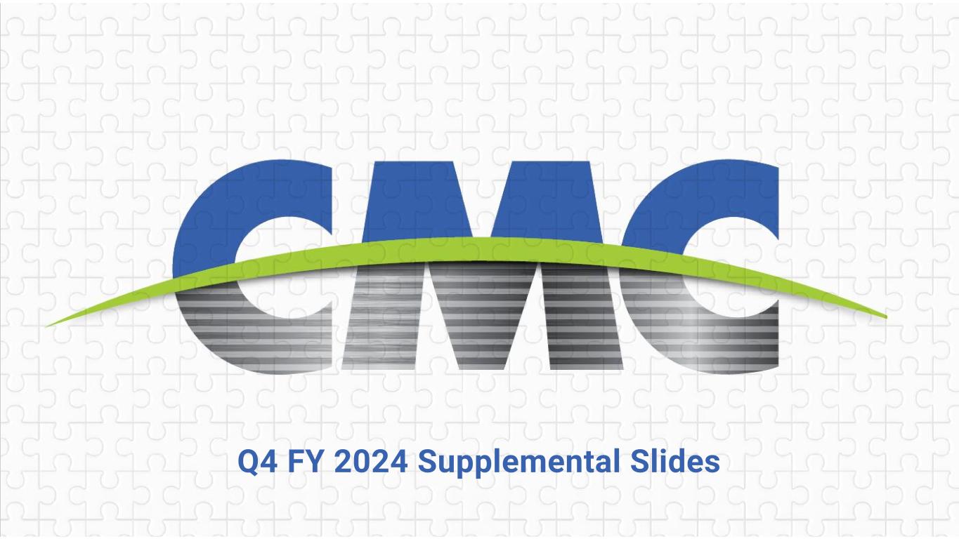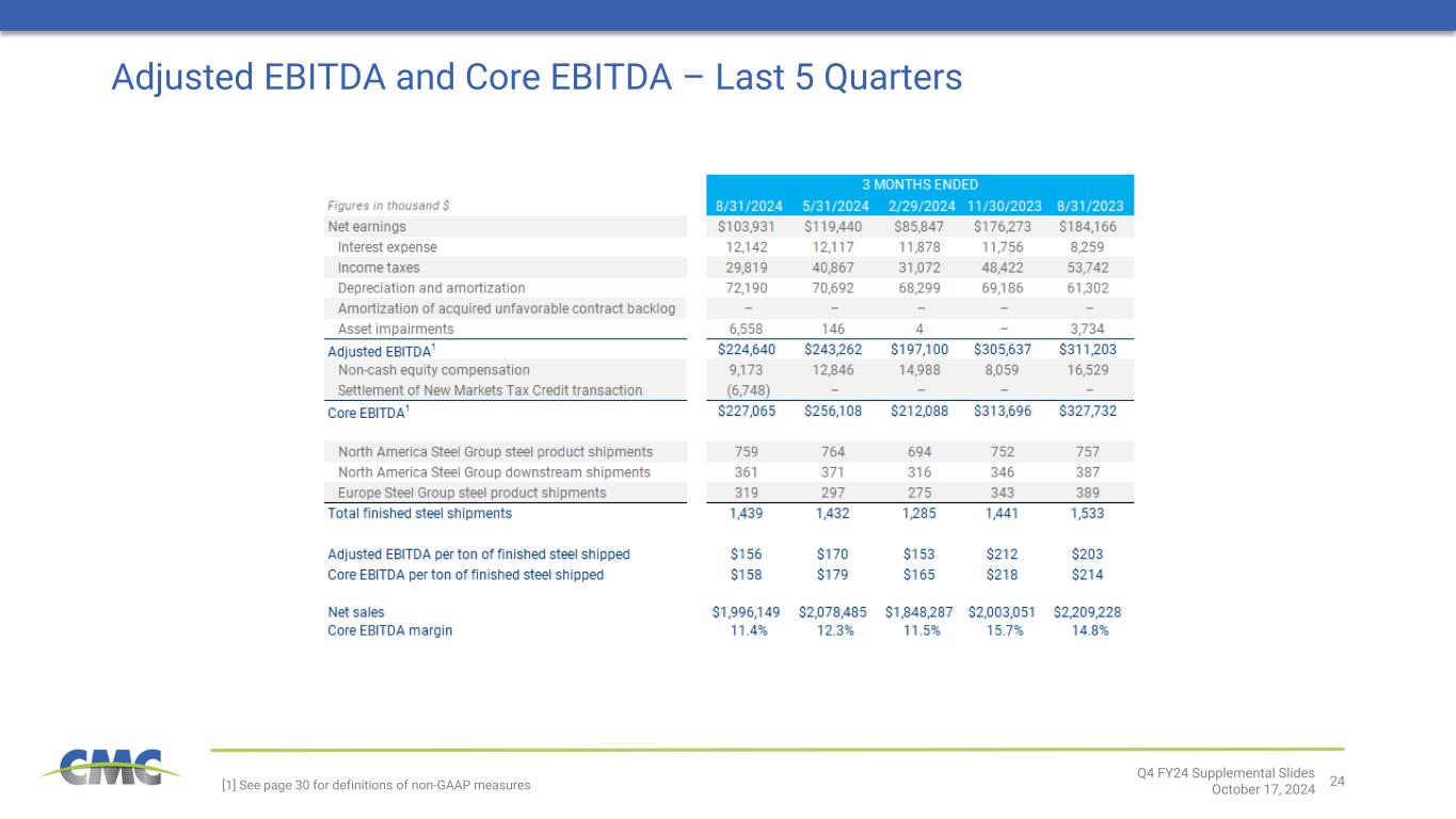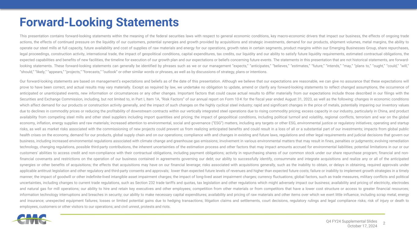2Q4 FY24 Supplemental Slides October 17, 2024 This presentation contains forward-looking statements within the meaning of the federal securities laws with respect to general economic conditions, key macro-economic drivers that impact our business, the effects of ongoing trade actions, the effects of continued pressure on the liquidity of our customers, potential synergies and growth provided by acquisitions and strategic investments, demand for our products, shipment volumes, metal margins, the ability to operate our steel mills at full capacity, future availability and cost of supplies of raw materials and energy for our operations, growth rates in certain segments, product margins within our Emerging Businesses Group, share repurchases, legal proceedings, construction activity, international trade, the impact of geopolitical conditions, capital expenditures, tax credits, our liquidity and our ability to satisfy future liquidity requirements, estimated contractual obligations, the expected capabilities and benefits of new facilities, the timeline for execution of our growth plan and our expectations or beliefs concerning future events. The statements in this presentation that are not historical statements, are forward- looking statements. These forward-looking statements can generally be identified by phrases such as we or our management “expects,” “anticipates,” “believes,” “estimates,” “future,” “intends,” “may,” “plans to,” “ought,” “could,” “will,” “should,” “likely,” “appears,” “projects,” “forecasts,” “outlook” or other similar words or phrases, as well as by discussions of strategy, plans or intentions. Our forward-looking statements are based on management’s expectations and beliefs as of the date of this presentation. Although we believe that our expectations are reasonable, we can give no assurance that these expectations will prove to have been correct, and actual results may vary materially. Except as required by law, we undertake no obligation to update, amend or clarify any forward-looking statements to reflect changed assumptions, the occurrence of anticipated or unanticipated events, new information or circumstances or any other changes. Important factors that could cause actual results to differ materially from our expectations include those described in our filings with the Securities and Exchange Commission, including, but not limited to, in Part I, Item 1A, “Risk Factors” of our annual report on Form 10-K for the fiscal year ended August 31, 2023, as well as the following: changes in economic conditions which affect demand for our products or construction activity generally, and the impact of such changes on the highly cyclical steel industry; rapid and significant changes in the price of metals, potentially impairing our inventory values due to declines in commodity prices or reducing the profitability of downstream contracts within our vertically integrated steel operations due to rising commodity pricing; excess capacity in our industry, particularly in China, and product availability from competing steel mills and other steel suppliers including import quantities and pricing; the impact of geopolitical conditions, including political turmoil and volatility, regional conflicts, terrorism and war on the global economy, inflation, energy supplies and raw materials; increased attention to environmental, social and governance (“ESG”) matters, including any targets or other ESG, environmental justice or regulatory initiatives; operating and startup risks, as well as market risks associated with the commissioning of new projects could prevent us from realizing anticipated benefits and could result in a loss of all or a substantial part of our investments; impacts from global public health crises on the economy, demand for our products, global supply chain and on our operations; compliance with and changes in existing and future laws, regulations and other legal requirements and judicial decisions that govern our business, including increased environmental regulations associated with climate change and greenhouse gas emissions; involvement in various environmental matters that may result in fines, penalties or judgments; evolving remediation technology, changing regulations, possible third-party contributions, the inherent uncertainties of the estimation process and other factors that may impact amounts accrued for environmental liabilities; potential limitations in our or our customers' abilities to access credit and non-compliance with their contractual obligations, including payment obligations; activity in repurchasing shares of our common stock under our share repurchase program; financial and non- financial covenants and restrictions on the operation of our business contained in agreements governing our debt; our ability to successfully identify, consummate and integrate acquisitions and realize any or all of the anticipated synergies or other benefits of acquisitions; the effects that acquisitions may have on our financial leverage; risks associated with acquisitions generally, such as the inability to obtain, or delays in obtaining, required approvals under applicable antitrust legislation and other regulatory and third-party consents and approvals; lower than expected future levels of revenues and higher than expected future costs; failure or inability to implement growth strategies in a timely manner; the impact of goodwill or other indefinite-lived intangible asset impairment charges; the impact of long-lived asset impairment charges; currency fluctuations; global factors, such as trade measures, military conflicts and political uncertainties, including changes to current trade regulations, such as Section 232 trade tariffs and quotas, tax legislation and other regulations which might adversely impact our business; availability and pricing of electricity, electrodes and natural gas f