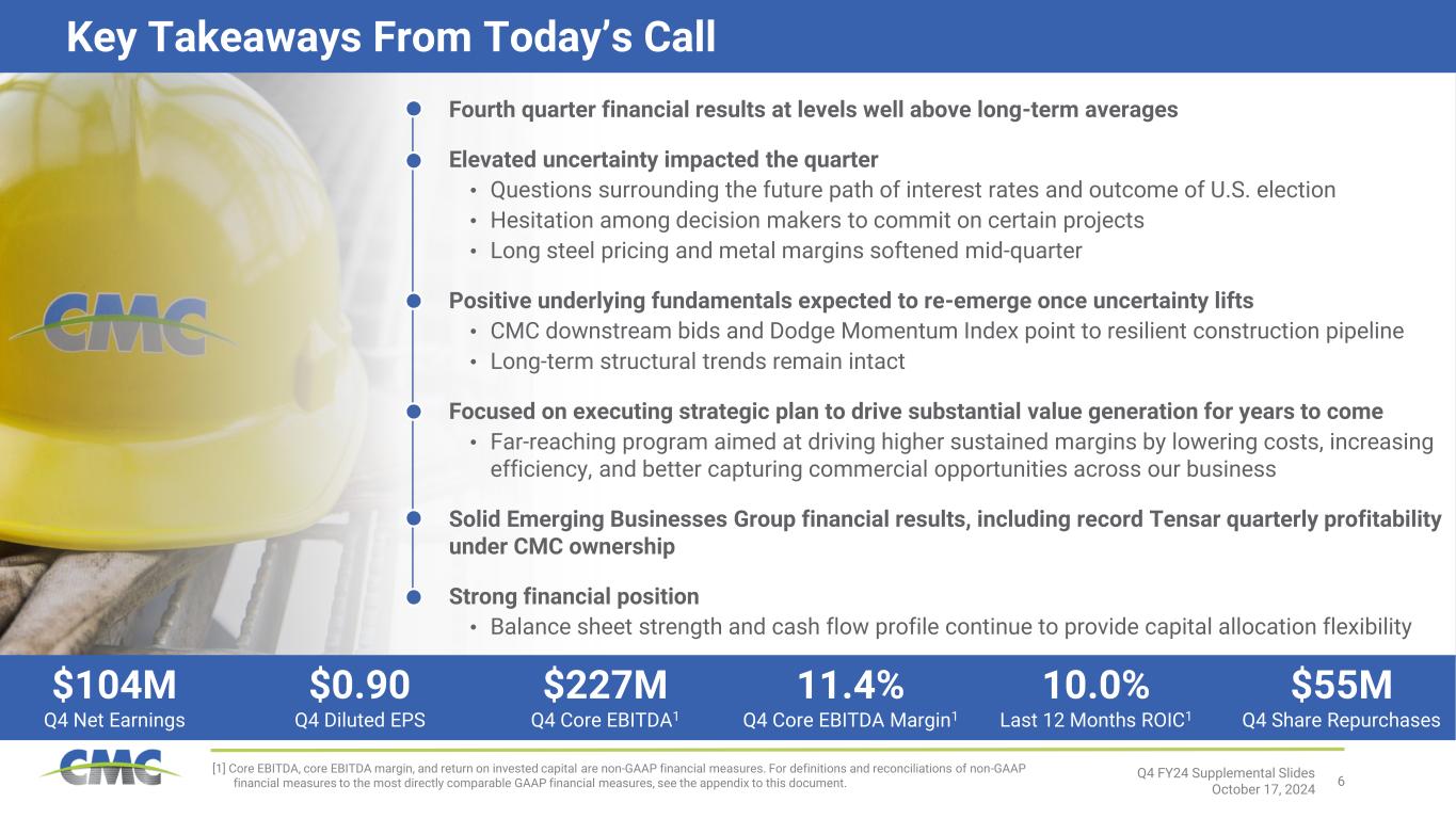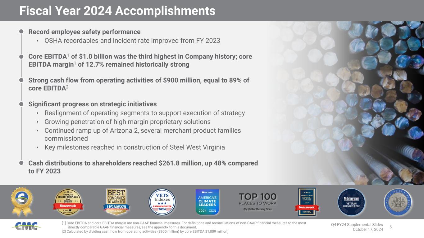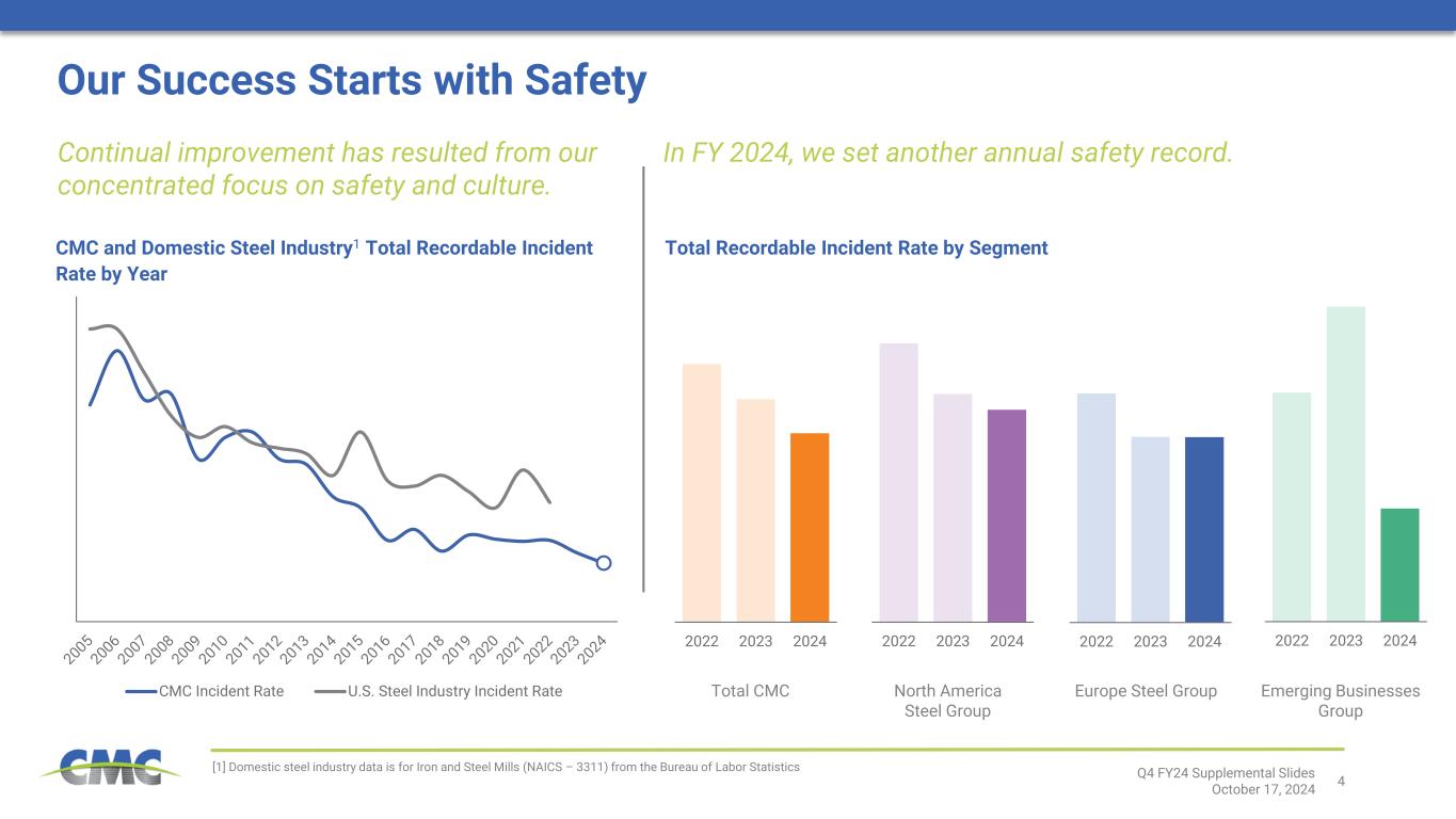2Q4 FY24 Supplemental Slides October 17, 2024 This presentation contains forward-looking statements within the meaning of the federal securities laws with respect to general economic conditions, key macro-economic drivers that impact our business, the effects of ongoing trade actions, the effects of continued pressure on the liquidity of our customers, potential synergies and growth provided by acquisitions and strategic investments, demand for our products, shipment volumes, metal margins, the ability to operate our steel mills at full capacity, future availability and cost of supplies of raw materials and energy for our operations, growth rates in certain segments, product margins within our Emerging Businesses Group, share repurchases, legal proceedings, construction activity, international trade, the impact of geopolitical conditions, capital expenditures, tax credits, our liquidity and our ability to satisfy future liquidity requirements, estimated contractual obligations, the expected capabilities and benefits of new facilities, the timeline for execution of our growth plan and our expectations or beliefs concerning future events. The statements in this presentation that are not historical statements, are forward- looking statements. These forward-looking statements can generally be identified by phrases such as we or our management “expects,” “anticipates,” “believes,” “estimates,” “future,” “intends,” “may,” “plans to,” “ought,” “could,” “will,” “should,” “likely,” “appears,” “projects,” “forecasts,” “outlook” or other similar words or phrases, as well as by discussions of strategy, plans or intentions. Our forward-looking statements are based on management’s expectations and beliefs as of the date of this presentation. Although we believe that our expectations are reasonable, we can give no assurance that these expectations will prove to have been correct, and actual results may vary materially. Except as required by law, we undertake no obligation to update, amend or clarify any forward-looking statements to reflect changed assumptions, the occurrence of anticipated or unanticipated events, new information or circumstances or any other changes. Important factors that could cause actual results to differ materially from our expectations include those described in our filings with the Securities and Exchange Commission, including, but not limited to, in Part I, Item 1A, “Risk Factors” of our annual report on Form 10-K for the fiscal year ended August 31, 2023, as well as the following: changes in economic conditions which affect demand for our products or construction activity generally, and the impact of such changes on the highly cyclical steel industry; rapid and significant changes in the price of metals, potentially impairing our inventory values due to declines in commodity prices or reducing the profitability of downstream contracts within our vertically integrated steel operations due to rising commodity pricing; excess capacity in our industry, particularly in China, and product availability from competing steel mills and other steel suppliers including import quantities and pricing; the impact of geopolitical conditions, including political turmoil and volatility, regional conflicts, terrorism and war on the global economy, inflation, energy supplies and raw materials; increased attention to environmental, social and governance (“ESG”) matters, including any targets or other ESG, environmental justice or regulatory initiatives; operating and startup risks, as well as market risks associated with the commissioning of new projects could prevent us from realizing anticipated benefits and could result in a loss of all or a substantial part of our investments; impacts from global public health crises on the economy, demand for our products, global supply chain and on our operations; compliance with and changes in existing and future laws, regulations and other legal requirements and judicial decisions that govern our business, including increased environmental regulations associated with climate change and greenhouse gas emissions; involvement in various environmental matters that may result in fines, penalties or judgments; evolving remediation technology, changing regulations, possible third-party contributions, the inherent uncertainties of the estimation process and other factors that may impact amounts accrued for environmental liabilities; potential limitations in our or our customers' abilities to access credit and non-compliance with their contractual obligations, including payment obligations; activity in repurchasing shares of our common stock under our share repurchase program; financial and non- financial covenants and restrictions on the operation of our business contained in agreements governing our debt; our ability to successfully identify, consummate and integrate acquisitions and realize any or all of the anticipated synergies or other benefits of acquisitions; the effects that acquisitions may have on our financial leverage; risks associated with acquisitions generally, such as the inability to obtain, or delays in obtaining, required approvals under applicable antitrust legislation and other regulatory and third-party consents and approvals; lower than expected future levels of revenues and higher than expected future costs; failure or inability to implement growth strategies in a timely manner; the impact of goodwill or other indefinite-lived intangible asset impairment charges; the impact of long-lived asset impairment charges; currency fluctuations; global factors, such as trade measures, military conflicts and political uncertainties, including changes to current trade regulations, such as Section 232 trade tariffs and quotas, tax legislation and other regulations which might adversely impact our business; availability and pricing of electricity, electrodes and natural gas f