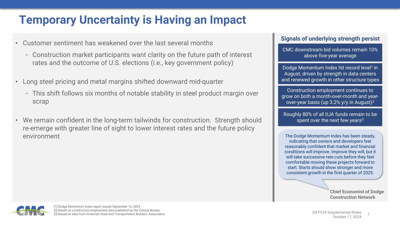 6 Fourth quarter financial results at levels well above long-term averages Elevated uncertainty impacted the quarter • Questions surrounding the future path of interest rates and outcome of U.S. election • Hesitation among decision makers to commit on certain projects • Long steel pricing and metal margins softened mid-quarter Positive underlying fundamentals expected to re-emerge once uncertainty lifts • CMC downstream bids and Dodge Momentum Index point to resilient construction pipeline • Long-term structural trends remain intact Focused on executing strategic plan to drive substantial value generation for years to come • Far-reaching program aimed at driving higher sustained margins by lowering costs, increasing efficiency, and better capturing commercial opportunities across our business Solid Emerging Businesses Group financial results, including record Tensar quarterly profitability under CMC ownership Strong financial position • Balance sheet strength and cash flow profile continue to provide capital allocation flexibility Q4 FY24 Supplemental Slides October 17, 2024 [1] Core EBITDA, core EBITDA margin, and return on invested capital are non-GAAP financial measures. For definitions and reconciliations of non-GAAP financial measures to the most directly comparable GAAP financial measures, see the appendix to this document. $104M Q4 Net Earnings $0.90 Q4 Diluted EPS $227M Q4 Core EBITDA1 11.4% Q4 Core EBITDA Margin1 10.0% Last 12 Months ROIC1 $55M Q4 Share Repurchases Key Takeaways From Today’s Call