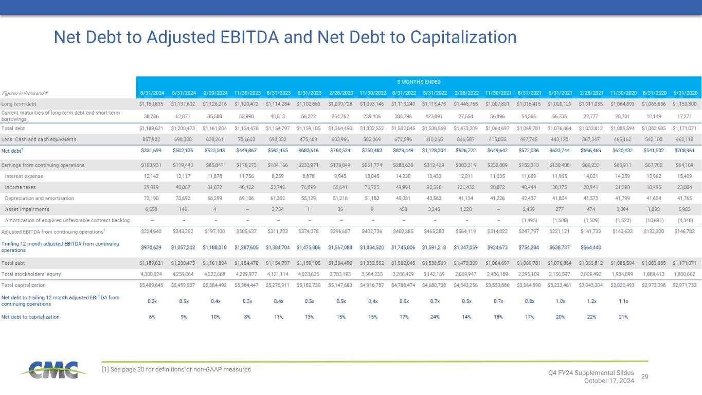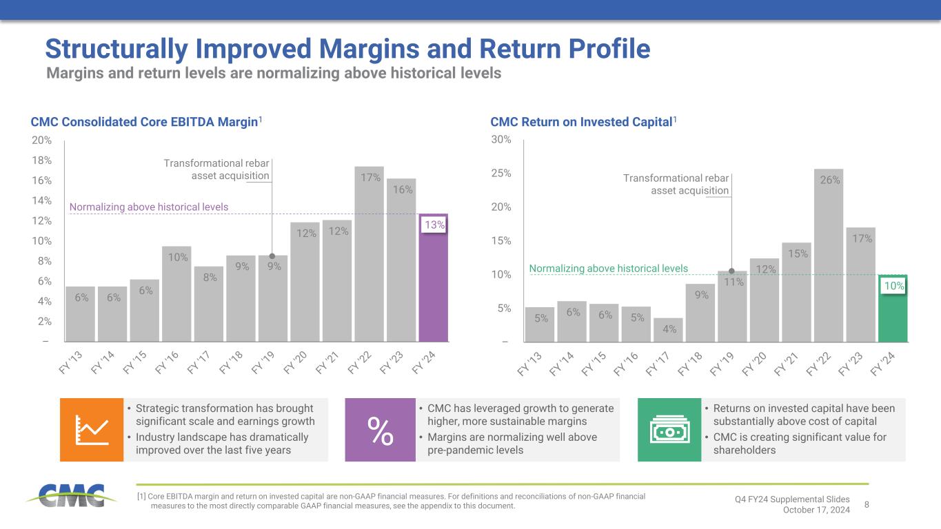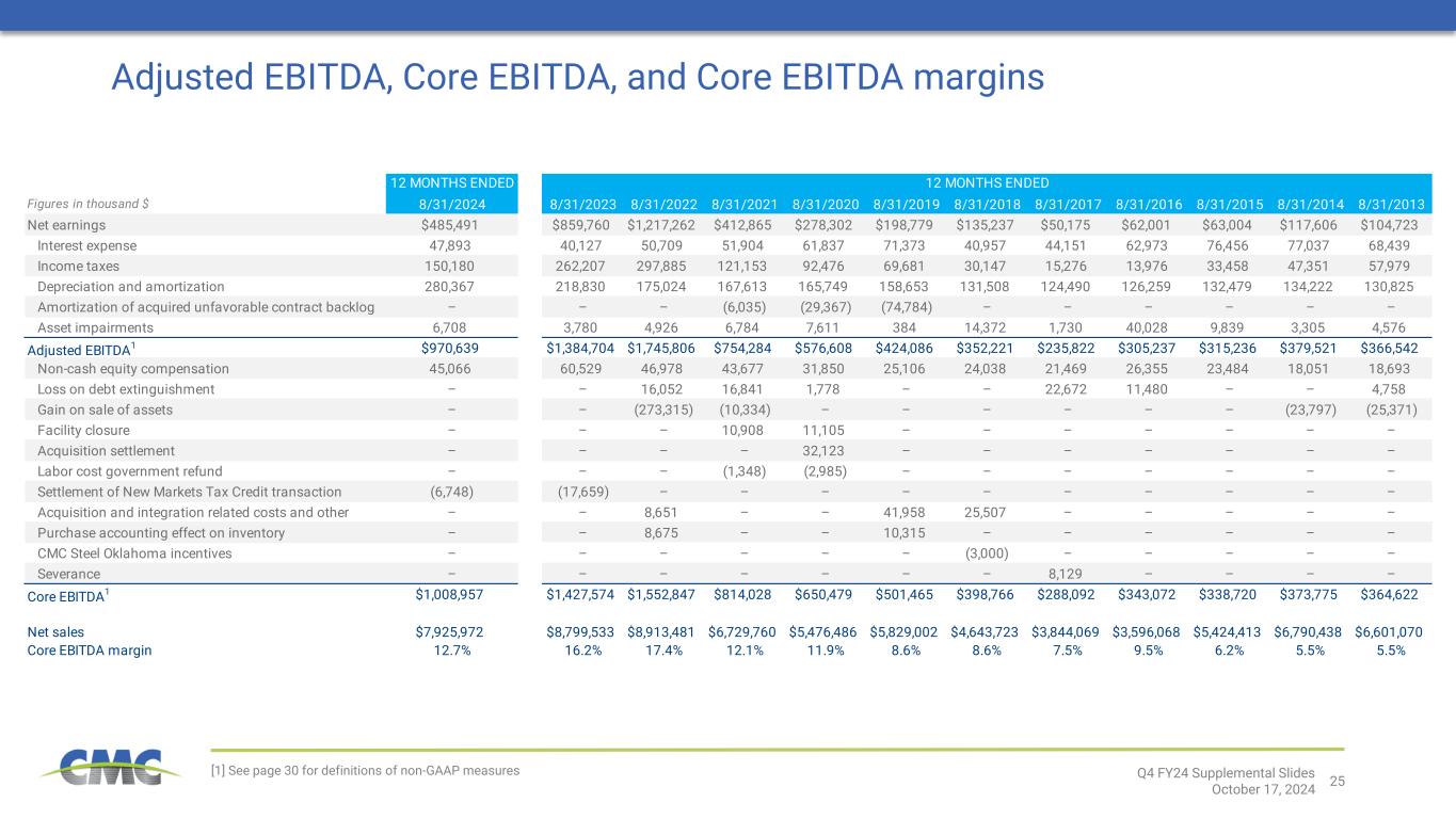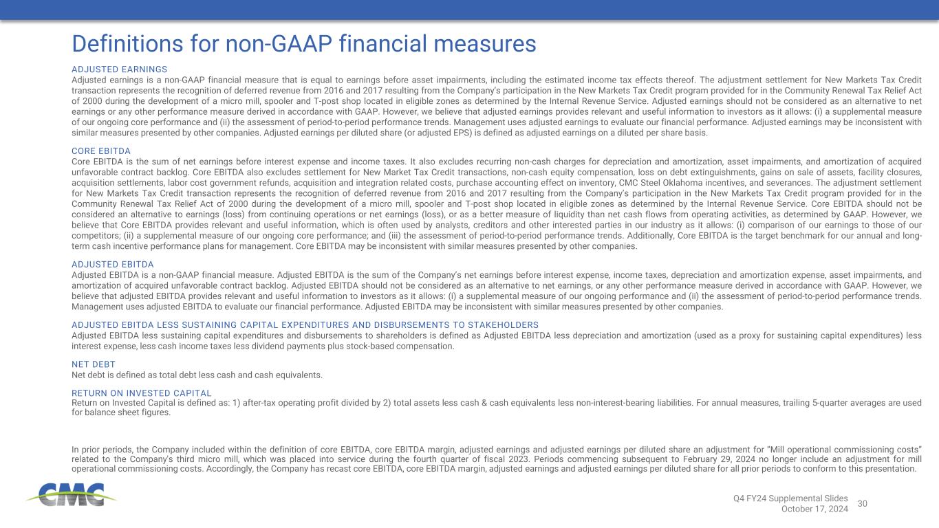 30 Definitions for non-GAAP financial measures ADJUSTED EARNINGS Adjusted earnings is a non-GAAP financial measure that is equal to earnings before asset impairments, including the estimated income tax effects thereof. The adjustment settlement for New Markets Tax Credit transaction represents the recognition of deferred revenue from 2016 and 2017 resulting from the Company’s participation in the New Markets Tax Credit program provided for in the Community Renewal Tax Relief Act of 2000 during the development of a micro mill, spooler and T-post shop located in eligible zones as determined by the Internal Revenue Service. Adjusted earnings should not be considered as an alternative to net earnings or any other performance measure derived in accordance with GAAP. However, we believe that adjusted earnings provides relevant and useful information to investors as it allows: (i) a supplemental measure of our ongoing core performance and (ii) the assessment of period-to-period performance trends. Management uses adjusted earnings to evaluate our financial performance. Adjusted earnings may be inconsistent with similar measures presented by other companies. Adjusted earnings per diluted share (or adjusted EPS) is defined as adjusted earnings on a diluted per share basis. CORE EBITDA Core EBITDA is the sum of net earnings before interest expense and income taxes. It also excludes recurring non-cash charges for depreciation and amortization, asset impairments, and amortization of acquired unfavorable contract backlog. Core EBITDA also excludes settlement for New Market Tax Credit transactions, non-cash equity compensation, loss on debt extinguishments, gains on sale of assets, facility closures, acquisition settlements, labor cost government refunds, acquisition and integration related costs, purchase accounting effect on inventory, CMC Steel Oklahoma incentives, and severances. The adjustment settlement for New Markets Tax Credit transaction represents the recognition of deferred revenue from 2016 and 2017 resulting from the Company’s participation in the New Markets Tax Credit program provided for in the Community Renewal Tax Relief Act of 2000 during the development of a micro mill, spooler and T-post shop located in eligible zones as determined by the Internal Revenue Service. Core EBITDA should not be considered an alternative to earnings (loss) from continuing operations or net earnings (loss), or as a better measure of liquidity than net cash flows from operating activities, as determined by GAAP. However, we believe that Core EBITDA provides relevant and useful information, which is often used by analysts, creditors and other interested parties in our industry as it allows: (i) comparison of our earnings to those of our competitors; (ii) a supplemental measure of our ongoing core performance; and (iii) the assessment of period-to-period performance trends. Additionally, Core EBITDA is the target benchmark for our annual and long- term cash incentive performance plans for management. Core EBITDA may be inconsistent with similar measures presented by other companies. ADJUSTED EBITDA Adjusted EBITDA is a non-GAAP financial measure. Adjusted EBITDA is the sum of the Company’s net earnings before interest expense, income taxes, depreciation and amortization expense, asset impairments, and amortization of acquired unfavorable contract backlog. Adjusted EBITDA should not be considered as an alternative to net earnings, or any other performance measure derived in accordance with GAAP. However, we believe that adjusted EBITDA provides relevant and useful information to investors as it allows: (i) a supplemental measure of our ongoing performance and (ii) the assessment of period-to-period performance trends. Management uses adjusted EBITDA to evaluate our financial performance. Adjusted EBITDA may be inconsistent with similar measures presented by other companies. ADJUSTED EBITDA LESS SUSTAINING CAPITAL EXPENDITURES AND DISBURSEMENTS TO STAKEHOLDERS Adjusted EBITDA less sustaining capital expenditures and disbursements to shareholders is defined as Adjusted EBITDA less depreciation and amortization (used as a proxy for sustaining capital expenditures) less interest expense, less cash income taxes less dividend payments plus stock-based compensation. NET DEBT Net debt is defined as total debt less cash and cash equivalents. RETURN ON INVESTED CAPITAL Return on Invested Capital is defined as: 1) after-tax operating profit divided by 2) total assets less cash & cash equivalents less non-interest-bearing liabilities. For annual measures, trailing 5-quarter averages are used for balance sheet figures. In prior periods, the Company included within the definition of core EBITDA, core EBITDA margin, adjusted earnings and adjusted earnings per diluted share an adjustment for “Mill operational commissioning costs” related to the Company's third micro mill, which was placed into service during the fourth quarter of fiscal 2023. Periods commencing subsequent to February 29, 2024 no longer include an adjustment for mill operational commissioning costs. Accordingly, the Company has recast core EBITDA, core EBITDA margin, adjusted earnings and adjusted earnings per diluted share for all prior periods to conform to this presentation. Q4 FY24 Supplemental Slides October 17, 2024