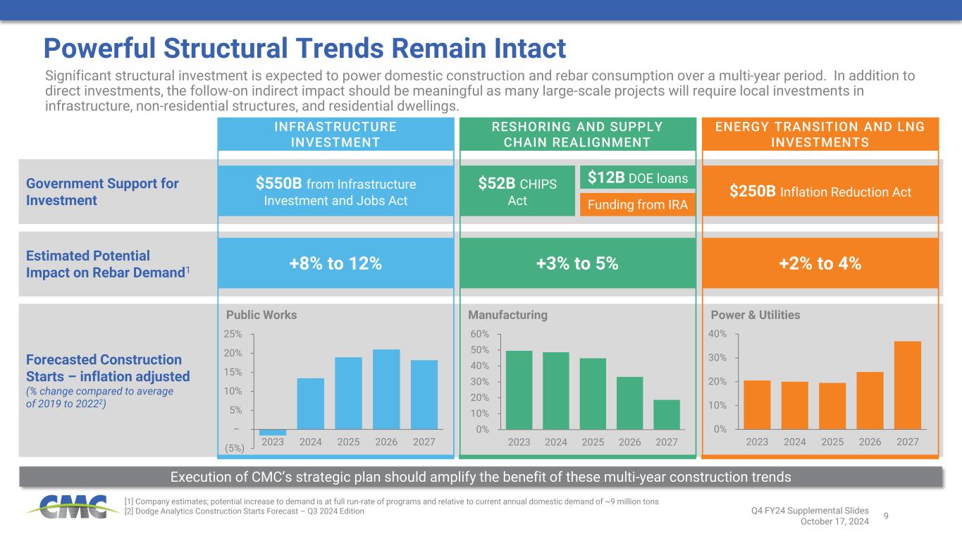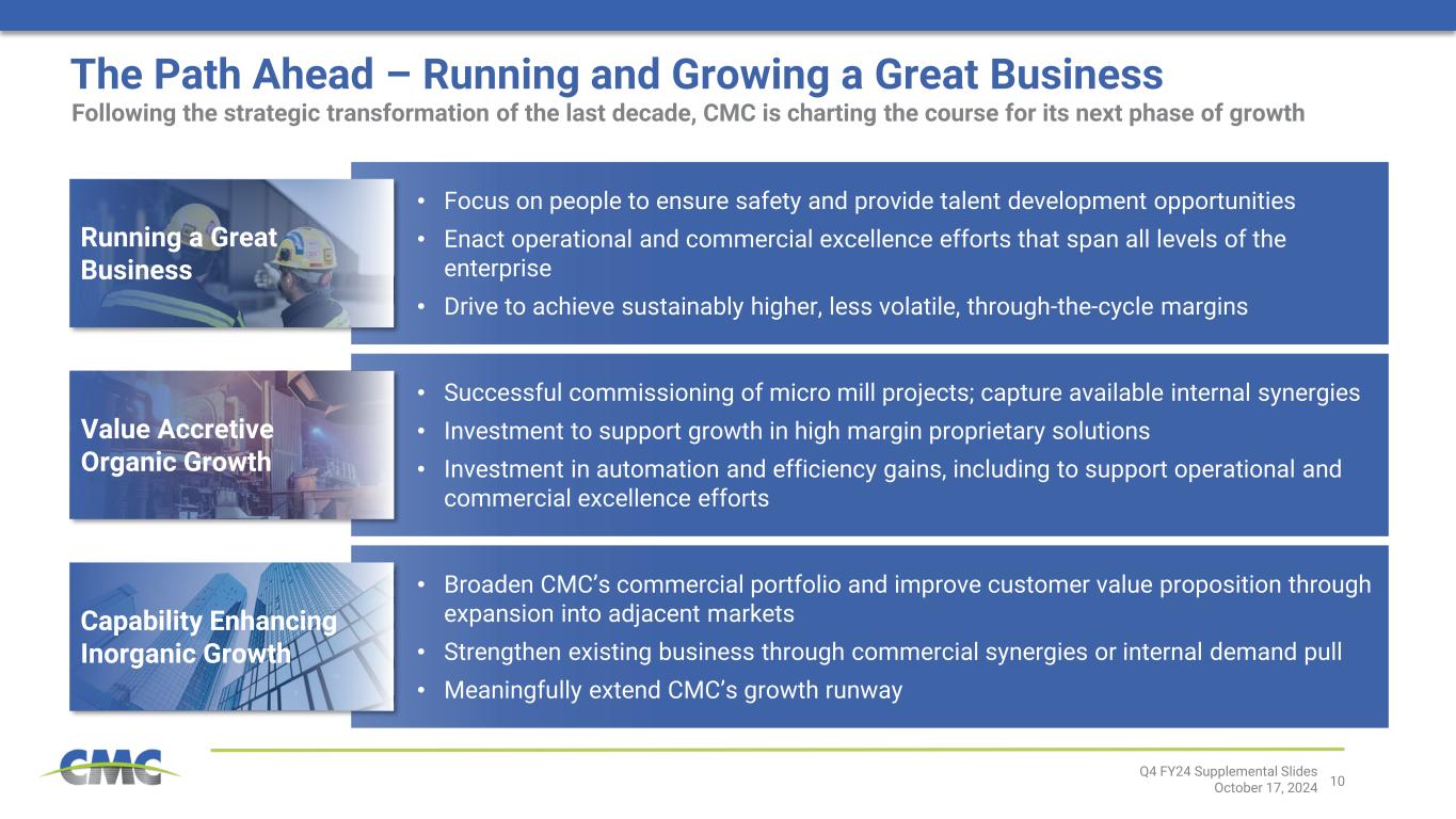 9 Forecasted Construction Starts – inflation adjusted (% change compared to average of 2019 to 20222) 0% 10% 20% 30% 40% 2023 2024 2025 2026 2027 0% 10% 20% 30% 40% 50% 60% 2023 2024 2025 2026 2027 (5%) – 5% 10% 15% 20% 25% 2023 2024 2025 2026 2027 Estimated Potential Impact on Rebar Demand1 Government Support for Investment Powerful Structural Trends Remain Intact RESHORING AND SUPPLY CHAIN REALIGNMENT ENERGY TRANSITION AND LNG INVESTMENTS Significant structural investment is expected to power domestic construction and rebar consumption over a multi-year period. In addition to direct investments, the follow-on indirect impact should be meaningful as many large-scale projects will require local investments in infrastructure, non-residential structures, and residential dwellings. [1] Company estimates; potential increase to demand is at full run-rate of programs and relative to current annual domestic demand of ~9 million tons [2] Dodge Analytics Construction Starts Forecast – Q3 2024 Edition INFRASTRUCTURE INVESTMENT $550B from Infrastructure Investment and Jobs Act $52B CHIPS Act $250B Inflation Reduction Act $12B DOE loans Funding from IRA Q4 FY24 Supplemental Slides October 17, 2024 +8% to 12% +3% to 5% +2% to 4% Public Works Manufacturing Power & Utilities Execution of CMC’s strategic plan should amplify the benefit of these multi-year construction trends