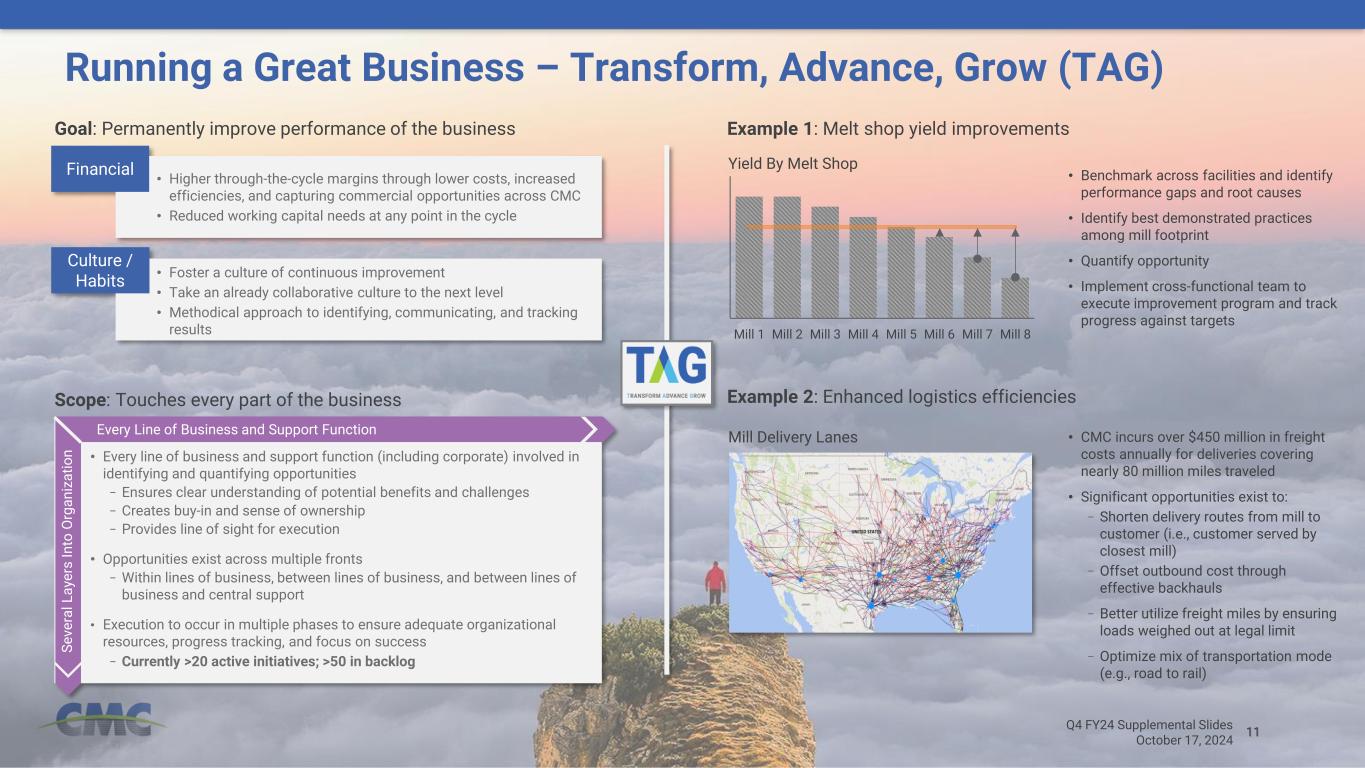 11 Running a Great Business – Transform, Advance, Grow (TAG) • Every line of business and support function (including corporate) involved in identifying and quantifying opportunities − Ensures clear understanding of potential benefits and challenges − Creates buy-in and sense of ownership − Provides line of sight for execution • Opportunities exist across multiple fronts − Within lines of business, between lines of business, and between lines of business and central support • Execution to occur in multiple phases to ensure adequate organizational resources, progress tracking, and focus on success − Currently >20 active initiatives; >50 in backlog S e ve ra l L a ye rs I n to O rg a n iz a ti o n Every Line of Business and Support Function Scope: Touches every part of the business Goal: Permanently improve performance of the business • Higher through-the-cycle margins through lower costs, increased efficiencies, and capturing commercial opportunities across CMC • Reduced working capital needs at any point in the cycle Financial • Foster a culture of continuous improvement • Take an already collaborative culture to the next level • Methodical approach to identifying, communicating, and tracking results Culture / Habits Example 1: Melt shop yield improvements Mill 1 Mill 2 Mill 3 Mill 4 Mill 5 Mill 6 Mill 7 Mill 8 Yield By Melt Shop • Benchmark across facilities and identify performance gaps and root causes • Identify best demonstrated practices among mill footprint • Quantify opportunity • Implement cross-functional team to execute improvement program and track progress against targets Example 2: Enhanced logistics efficiencies Mill Delivery Lanes • CMC incurs over $450 million in freight costs annually for deliveries covering nearly 80 million miles traveled • Significant opportunities exist to: − Shorten delivery routes from mill to customer (i.e., customer served by closest mill) − Offset outbound cost through effective backhauls − Better utilize freight miles by ensuring loads weighed out at legal limit − Optimize mix of transportation mode (e.g., road to rail) Q4 FY24 Supplemental Slides October 17, 2024