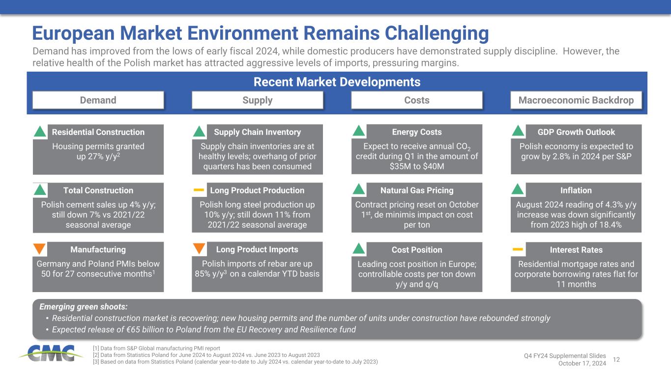 12 GDP Growth Outlook Polish economy is expected to grow by 2.8% in 2024 per S&P Recent Market Developments European Market Environment Remains Challenging [1] Data from S&P Global manufacturing PMI report [2] Data from Statistics Poland for June 2024 to August 2024 vs. June 2023 to August 2023 [3] Based on data from Statistics Poland (calendar year-to-date to July 2024 vs. calendar year-to-date to July 2023) Emerging green shoots: • Residential construction market is recovering; new housing permits and the number of units under construction have rebounded strongly • Expected release of €65 billion to Poland from the EU Recovery and Resilience fund Demand has improved from the lows of early fiscal 2024, while domestic producers have demonstrated supply discipline. However, the relative health of the Polish market has attracted aggressive levels of imports, pressuring margins. Demand Supply Costs Macroeconomic Backdrop Manufacturing Germany and Poland PMIs below 50 for 27 consecutive months1 Energy Costs Expect to receive annual CO2 credit during Q1 in the amount of $35M to $40M Natural Gas Pricing Contract pricing reset on October 1st, de minimis impact on cost per ton Cost Position Leading cost position in Europe; controllable costs per ton down y/y and q/q Inflation August 2024 reading of 4.3% y/y increase was down significantly from 2023 high of 18.4% Q4 FY24 Supplemental Slides October 17, 2024 Residential Construction Housing permits granted up 27% y/y2 Long Product Imports Polish imports of rebar are up 85% y/y3 on a calendar YTD basis Total Construction Polish cement sales up 4% y/y; still down 7% vs 2021/22 seasonal average Long Product Production Polish long steel production up 10% y/y; still down 11% from 2021/22 seasonal average Interest Rates Residential mortgage rates and corporate borrowing rates flat for 11 months Supply Chain Inventory Supply chain inventories are at healthy levels; overhang of prior quarters has been consumed