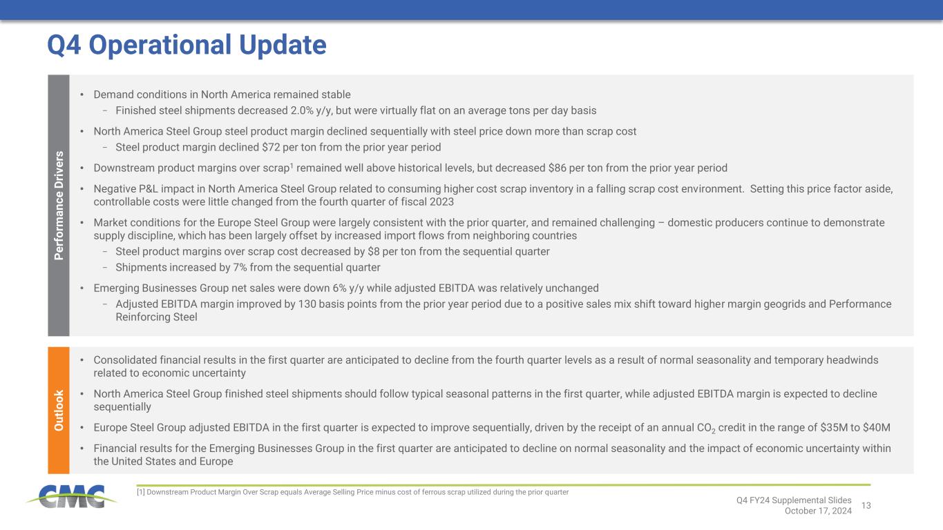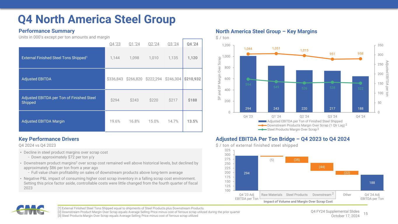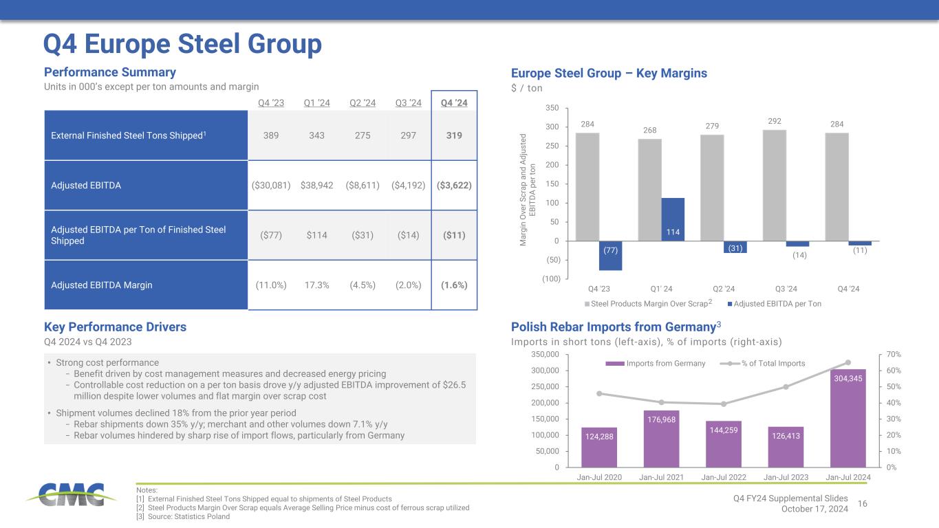 16 124,288 176,968 144,259 126,413 304,345 0% 10% 20% 30% 40% 50% 60% 70% 0 50,000 100,000 150,000 200,000 250,000 300,000 350,000 Jan-Jul 2020 Jan-Jul 2021 Jan-Jul 2022 Jan-Jul 2023 Jan-Jul 2024 Imports from Germany % of Total Imports 284 268 279 292 284 (77) 114 (31) (14) (11) (100) (50) 0 50 100 150 200 250 300 350 Q4 '23 Q1' 24 Q2 '24 Q3 '24 Q4 '24 Steel Products Margin Over Scrap Adjusted EBITDA per Ton Key Performance Drivers Q4 2024 vs Q4 2023 Q4 Europe Steel Group Q4 ’23 Q1 ’24 Q2 ’24 Q3 ’24 Q4 ’24 External Finished Steel Tons Shipped1 389 343 275 297 319 Adjusted EBITDA ($30,081) $38,942 ($8,611) ($4,192) ($3,622) Adjusted EBITDA per Ton of Finished Steel Shipped ($77) $114 ($31) ($14) ($11) Adjusted EBITDA Margin (11.0%) 17.3% (4.5%) (2.0%) (1.6%) Performance Summary Units in 000’s except per ton amounts and margin • Strong cost performance − Benefit driven by cost management measures and decreased energy pricing − Controllable cost reduction on a per ton basis drove y/y adjusted EBITDA improvement of $26.5 million despite lower volumes and flat margin over scrap cost • Shipment volumes declined 18% from the prior year period − Rebar shipments down 35% y/y; merchant and other volumes down 7.1% y/y − Rebar volumes hindered by sharp rise of import flows, particularly from Germany Europe Steel Group – Key Margins $ / ton Polish Rebar Imports from Germany3 Imports in short tons (left-axis), % of imports (right-axis) 2 Notes: [1] External Finished Steel Tons Shipped equal to shipments of Steel Products [2] Steel Products Margin Over Scrap equals Average Selling Price minus cost of ferrous scrap utilized [3] Source: Statistics Poland M a rg in O ve r S c ra p a n d A d ju s te d E B IT D A p e r to n Q4 FY24 Supplemental Slides October 17, 2024