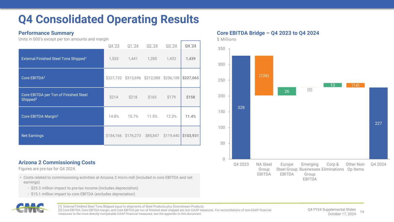 13 • Consolidated financial results in the first quarter are anticipated to decline from the fourth quarter levels as a result of normal seasonality and temporary headwinds related to economic uncertainty • North America Steel Group finished steel shipments should follow typical seasonal patterns in the first quarter, while adjusted EBITDA margin is expected to decline sequentially • Europe Steel Group adjusted EBITDA in the first quarter is expected to improve sequentially, driven by the receipt of an annual CO2 credit in the range of $35M to $40M • Financial results for the Emerging Businesses Group in the first quarter are anticipated to decline on normal seasonality and the impact of economic uncertainty within the United States and Europe • Demand conditions in North America remained stable − Finished steel shipments decreased 2.0% y/y, but were virtually flat on an average tons per day basis • North America Steel Group steel product margin declined sequentially with steel price down more than scrap cost − Steel product margin declined $72 per ton from the prior year period • Downstream product margins over scrap1 remained well above historical levels, but decreased $86 per ton from the prior year period • Negative P&L impact in North America Steel Group related to consuming higher cost scrap inventory in a falling scrap cost environment. Setting this price factor aside, controllable costs were little changed from the fourth quarter of fiscal 2023 • Market conditions for the Europe Steel Group were largely consistent with the prior quarter, and remained challenging – domestic producers continue to demonstrate supply discipline, which has been largely offset by increased import flows from neighboring countries − Steel product margins over scrap cost decreased by $8 per ton from the sequential quarter − Shipments increased by 7% from the sequential quarter • Emerging Businesses Group net sales were down 6% y/y while adjusted EBITDA was relatively unchanged − Adjusted EBITDA margin improved by 130 basis points from the prior year period due to a positive sales mix shift toward higher margin geogrids and Performance Reinforcing Steel P e rf o rm a n c e D ri v e rs O u tl o o k Q4 Operational Update [1] Downstream Product Margin Over Scrap equals Average Selling Price minus cost of ferrous scrap utilized during the prior quarter Q4 FY24 Supplemental Slides October 17, 2024