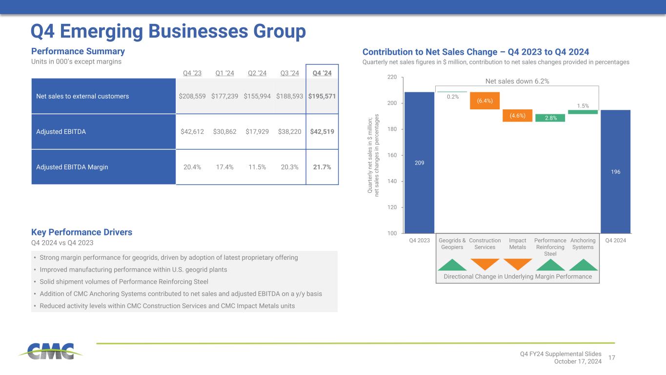 17 209 196 0.2% (6.4%) (4.6%) 2.8% 1.5% 100 120 140 160 180 200 220 Q4 2023 Geogrids & Geopiers Construction Services Impact Metals Performance Reinforcing Steel Anchoring Systems Q4 2024 Key Performance Drivers Q4 2024 vs Q4 2023 Q4 Emerging Businesses Group Q4 ’23 Q1 ’24 Q2 ’24 Q3 ’24 Q4 ’24 Net sales to external customers $208,559 $177,239 $155,994 $188,593 $195,571 Adjusted EBITDA $42,612 $30,862 $17,929 $38,220 $42,519 Adjusted EBITDA Margin 20.4% 17.4% 11.5% 20.3% 21.7% Performance Summary Units in 000’s except margins • Strong margin performance for geogrids, driven by adoption of latest proprietary offering • Improved manufacturing performance within U.S. geogrid plants • Solid shipment volumes of Performance Reinforcing Steel • Addition of CMC Anchoring Systems contributed to net sales and adjusted EBITDA on a y/y basis • Reduced activity levels within CMC Construction Services and CMC Impact Metals units Contribution to Net Sales Change – Q4 2023 to Q4 2024 Quarterly net sales figures in $ million, contribution to net sales changes provided in percentages Q4 FY24 Supplemental Slides October 17, 2024 Q u a rt e rl y n e t s a le s in $ m ill io n ; n e t s a le s c h a n g e s in p e rc e n ta g e s Net sales down 6.2% Directional Change in Underlying Margin Performance