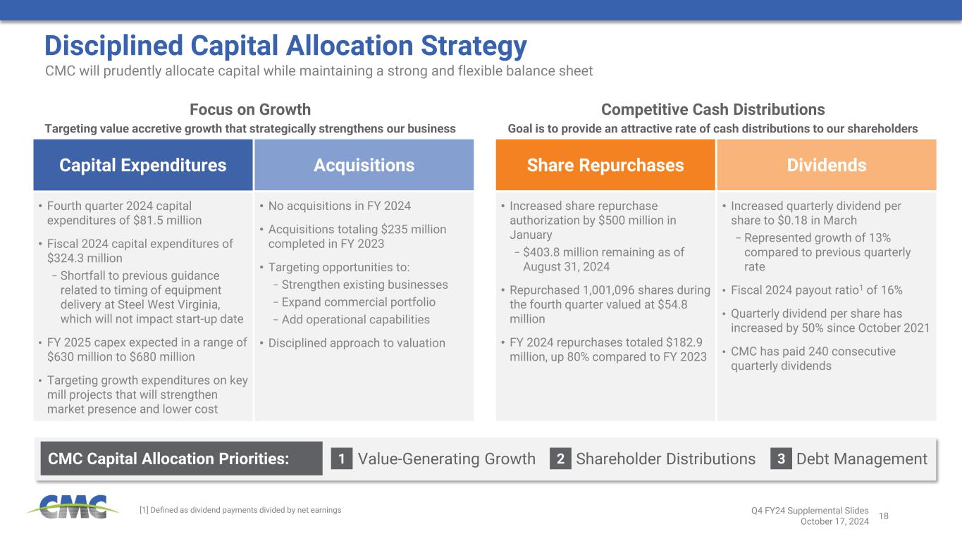 18 • Fourth quarter 2024 capital expenditures of $81.5 million • Fiscal 2024 capital expenditures of $324.3 million − Shortfall to previous guidance related to timing of equipment delivery at Steel West Virginia, which will not impact start-up date • FY 2025 capex expected in a range of $630 million to $680 million • Targeting growth expenditures on key mill projects that will strengthen market presence and lower cost Disciplined Capital Allocation Strategy CMC will prudently allocate capital while maintaining a strong and flexible balance sheet Q4 FY24 Supplemental Slides October 17, 2024 [1] Defined as dividend payments divided by net earnings 2 31 Value-Generating Growth Shareholder Distributions Debt ManagementCMC Capital Allocation Priorities: Capital Expenditures Acquisitions Share Repurchases Dividends • No acquisitions in FY 2024 • Acquisitions totaling $235 million completed in FY 2023 • Targeting opportunities to: − Strengthen existing businesses − Expand commercial portfolio − Add operational capabilities • Disciplined approach to valuation • Increased share repurchase authorization by $500 million in January − $403.8 million remaining as of August 31, 2024 • Repurchased 1,001,096 shares during the fourth quarter valued at $54.8 million • FY 2024 repurchases totaled $182.9 million, up 80% compared to FY 2023 • Increased quarterly dividend per share to $0.18 in March − Represented growth of 13% compared to previous quarterly rate • Fiscal 2024 payout ratio1 of 16% • Quarterly dividend per share has increased by 50% since October 2021 • CMC has paid 240 consecutive quarterly dividends Focus on Growth Targeting value accretive growth that strategically strengthens our business Competitive Cash Distributions Goal is to provide an attractive rate of cash distributions to our shareholders