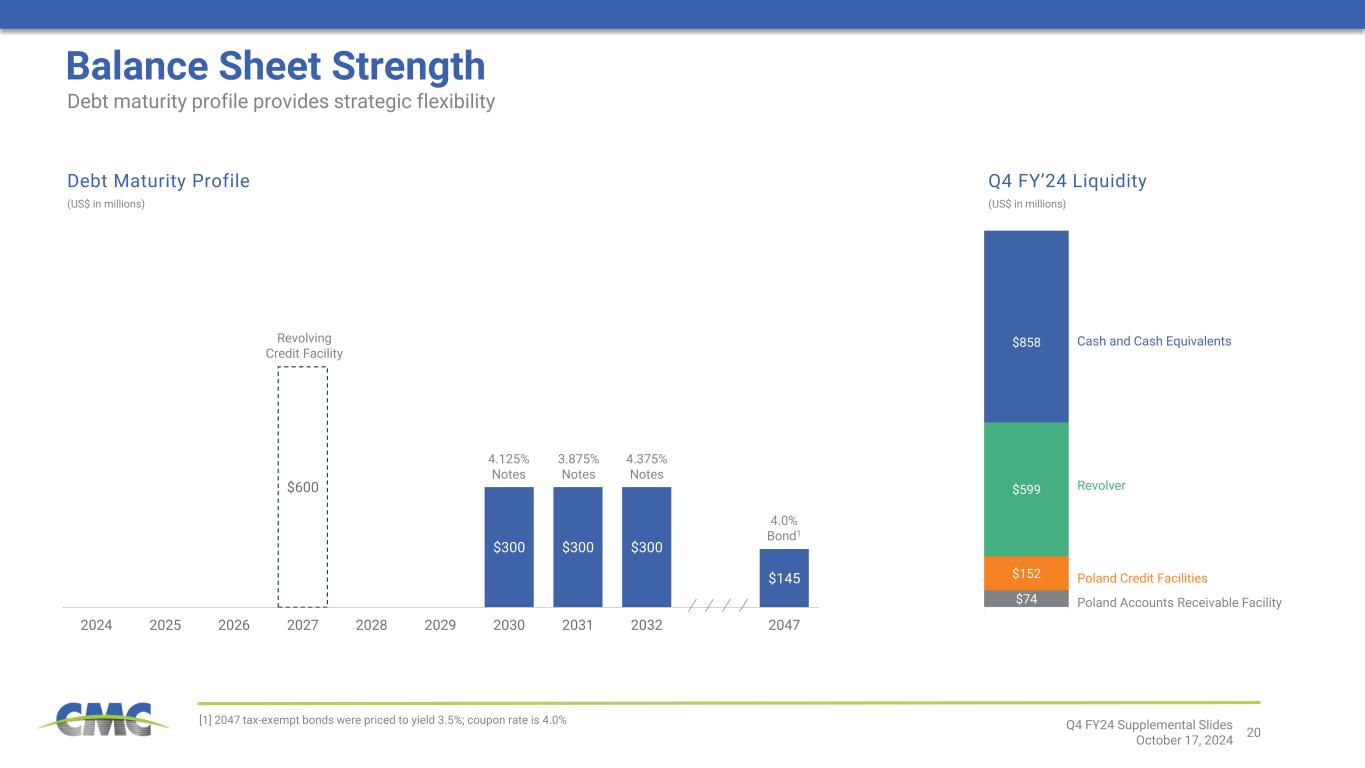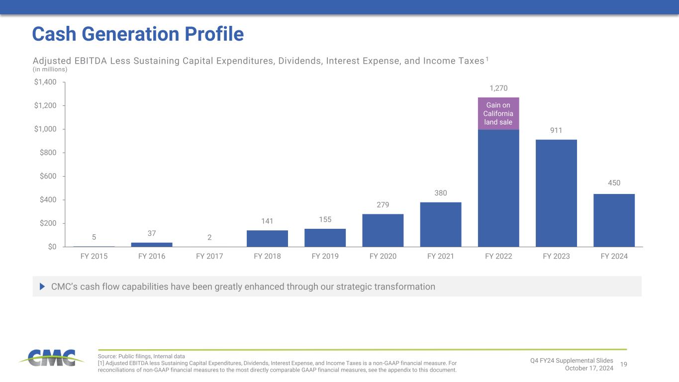 19 450 5 37 2 141 155 279 380 1,270 911 $0 $200 $400 $600 $800 $1,000 $1,200 $1,400 FY 2015 FY 2016 FY 2017 FY 2018 FY 2019 FY 2020 FY 2021 FY 2022 FY 2023 FY 2024 Cash Generation Profile Adjusted EBITDA Less Sustaining Capital Expenditures, Dividends, Interest Expense, and Income Taxes 1 (in millions) CMC’s cash flow capabilities have been greatly enhanced through our strategic transformation Source: Public filings, Internal data [1] Adjusted EBITDA less Sustaining Capital Expenditures, Dividends, Interest Expense, and Income Taxes is a non-GAAP financial measure. For reconciliations of non-GAAP financial measures to the most directly comparable GAAP financial measures, see the appendix to this document. Gain on California land sale Q4 FY24 Supplemental Slides October 17, 2024