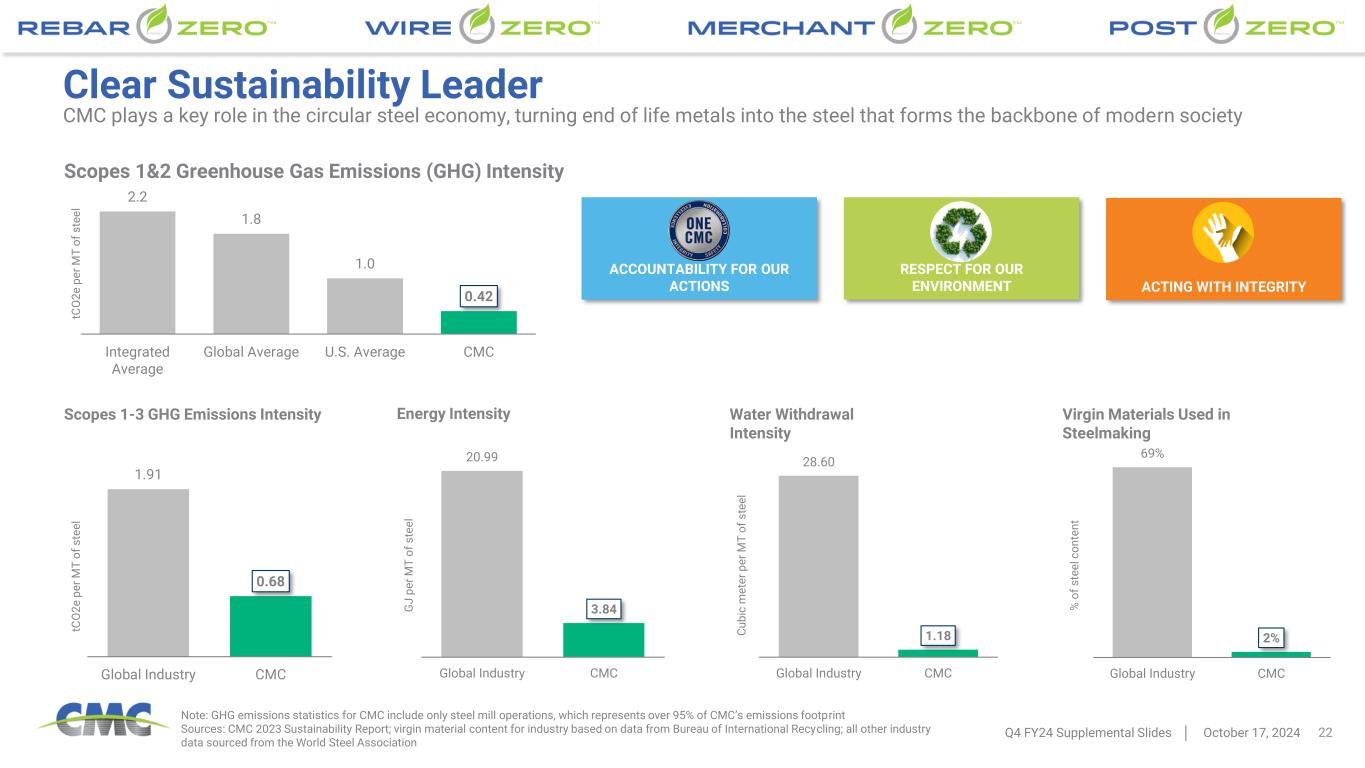 Clear Sustainability Leader Q4 FY24 Supplemental Slides │ October 17, 2024 22 Note: GHG emissions statistics for CMC include only steel mill operations, which represents over 95% of CMC’s emissions footprint Sources: CMC 2023 Sustainability Report; virgin material content for industry based on data from Bureau of International Recycling; all other industry data sourced from the World Steel Association CMC plays a key role in the circular steel economy, turning end of life metals into the steel that forms the backbone of modern society ACCOUNTABILITY FOR OUR ACTIONS RESPECT FOR OUR ENVIRONMENT ACTING WITH INTEGRITY 2.2 1.8 1.0 0.42 Integrated Average Global Average U.S. Average CMC Scopes 1&2 Greenhouse Gas Emissions (GHG) Intensity tC O 2 e p e r M T o f s te e l 0.68 1.91 CMCGlobal Industry Scopes 1-3 GHG Emissions Intensity tC O 2 e p e r M T o f s te e l 3.84 20.99 CMCGlobal Industry Energy Intensity G J p e r M T o f s te e l 1.18 28.60 CMCGlobal Industry Water Withdrawal Intensity C u b ic m e te r p e r M T o f s te e l 2% 69% CMCGlobal Industry Virgin Materials Used in Steelmaking % o f s te e l c o n te n t