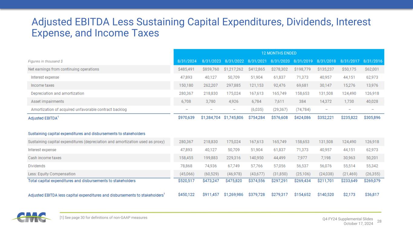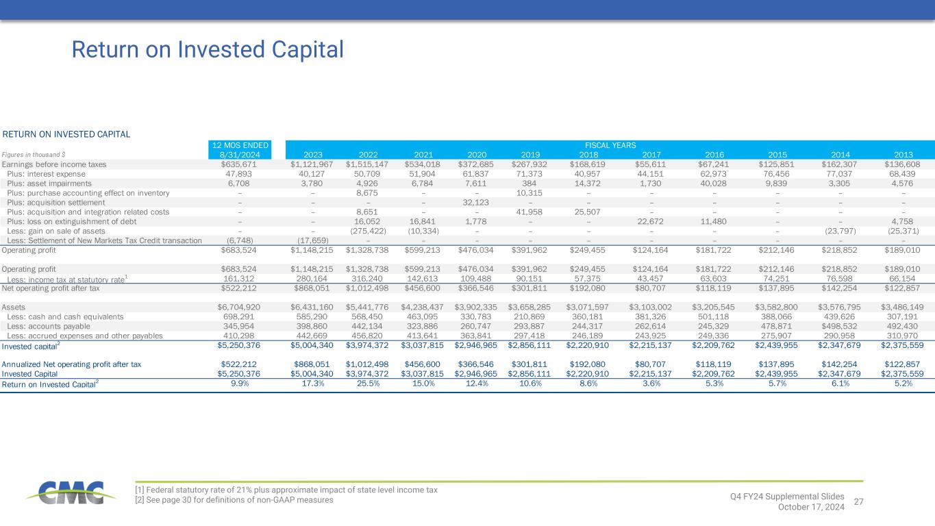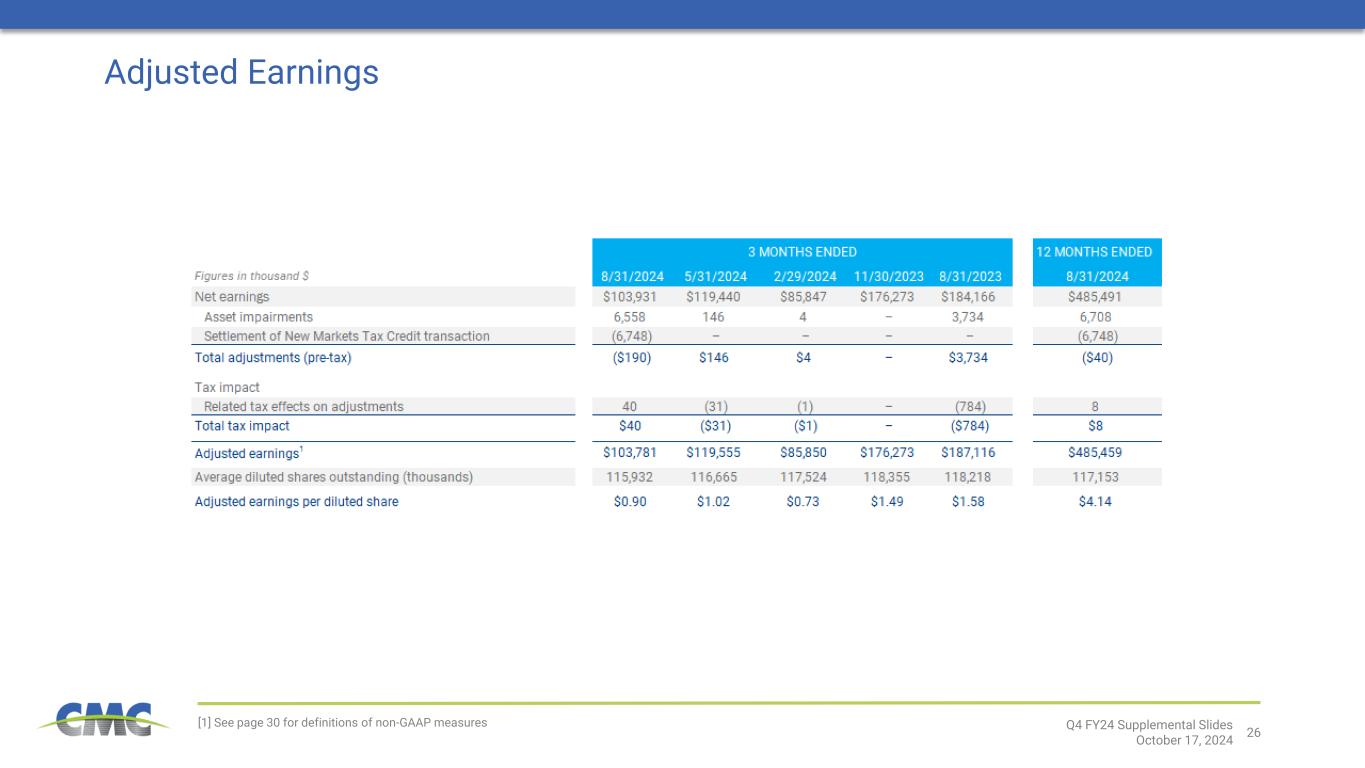 25 Adjusted EBITDA, Core EBITDA, and Core EBITDA margins [1] See page 30 for definitions of non-GAAP measures Q4 FY24 Supplemental Slides October 17, 2024 Figures in thousand $ 8/31/2024 8/31/2023 8/31/2022 8/31/2021 8/31/2020 8/31/2019 8/31/2018 8/31/2017 8/31/2016 8/31/2015 8/31/2014 8/31/2013 Net earnings $485,491 $859,760 $1,217,262 $412,865 $278,302 $198,779 $135,237 $50,175 $62,001 $63,004 $117,606 $104,723 Interest expense 47,893 40,127 50,709 51,904 61,837 71,373 40,957 44,151 62,973 76,456 77,037 68,439 Income taxes 150,180 262,207 297,885 121,153 92,476 69,681 30,147 15,276 13,976 33,458 47,351 57,979 Depreciation and amortization 280,367 218,830 175,024 167,613 165,749 158,653 131,508 124,490 126,259 132,479 134,222 130,825 Amortization of acquired unfavorable contract backlog – – – (6,035) (29,367) (74,784) – – – – – – Asset impairments 6,708 3,780 4,926 6,784 7,611 384 14,372 1,730 40,028 9,839 3,305 4,576 Adjusted EBITDA1 $970,639 $1,384,704 $1,745,806 $754,284 $576,608 $424,086 $352,221 $235,822 $305,237 $315,236 $379,521 $366,542 Non-cash equity compensation 45,066 60,529 46,978 43,677 31,850 25,106 24,038 21,469 26,355 23,484 18,051 18,693 Loss on debt extinguishment – – 16,052 16,841 1,778 – – 22,672 11,480 – – 4,758 Gain on sale of assets – – (273,315) (10,334) – – – – – – (23,797) (25,371) Facility closure – – – 10,908 11,105 – – – – – – – Acquisition settlement – – – – 32,123 – – – – – – – Labor cost government refund – – – (1,348) (2,985) – – – – – – – Settlement of New Markets Tax Credit transaction (6,748) (17,659) – – – – – – – – – – Acquisition and integration related costs and other – – 8,651 – – 41,958 25,507 – – – – – Purchase accounting effect on inventory – – 8,675 – – 10,315 – – – – – – CMC Steel Oklahoma incentives – – – – – – (3,000) – – – – – Severance – – – – – – – 8,129 – – – – Core EBITDA 1 $1,008,957 $1,427,574 $1,552,847 $814,028 $650,479 $501,465 $398,766 $288,092 $343,072 $338,720 $373,775 $364,622 Net sales $7,925,972 $8,799,533 $8,913,481 $6,729,760 $5,476,486 $5,829,002 $4,643,723 $3,844,069 $3,596,068 $5,424,413 $6,790,438 $6,601,070 Core EBITDA margin 12.7% 16.2% 17.4% 12.1% 11.9% 8.6% 8.6% 7.5% 9.5% 6.2% 5.5% 5.5% 12 MONTHS ENDED 12 MONTHS ENDED