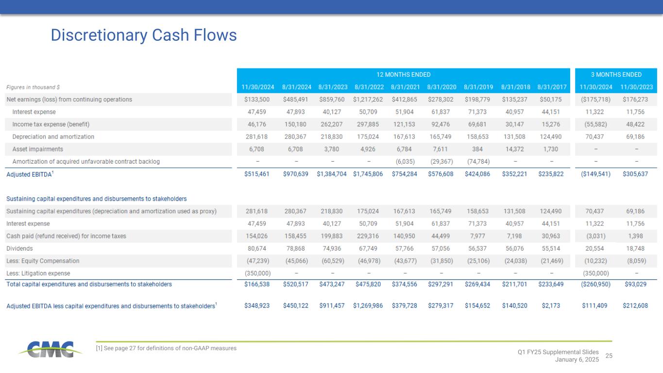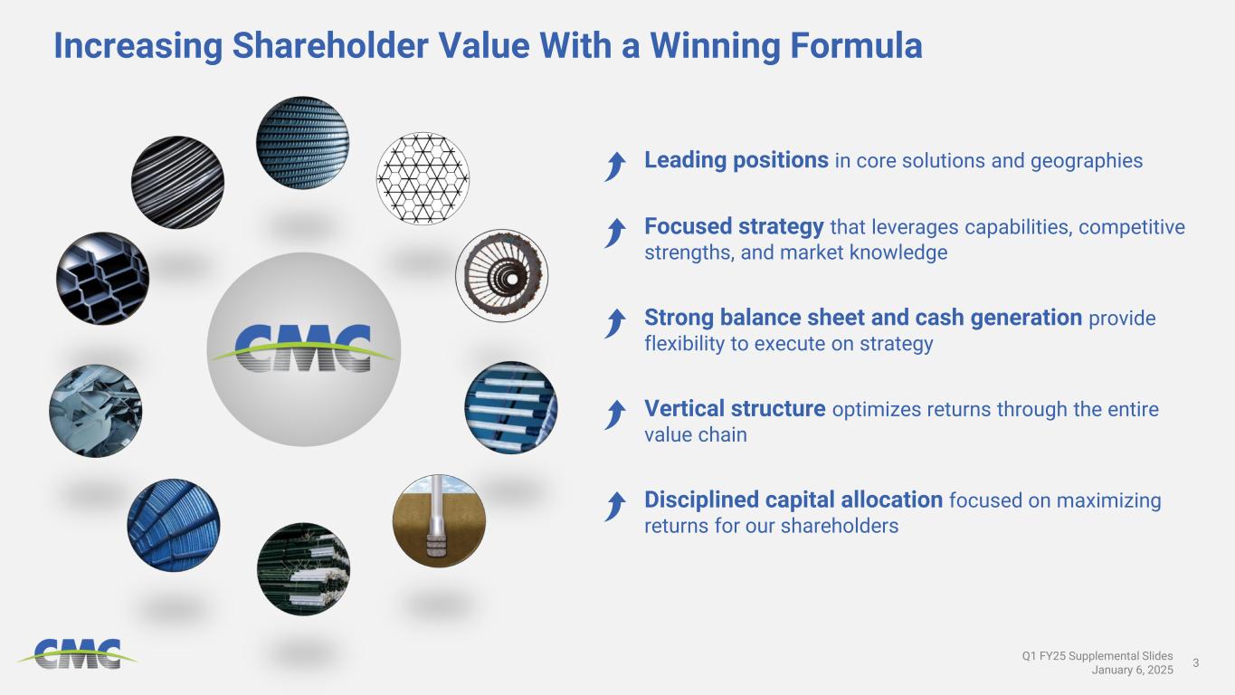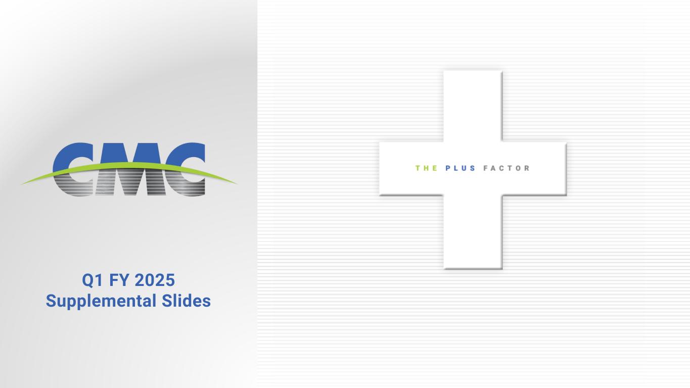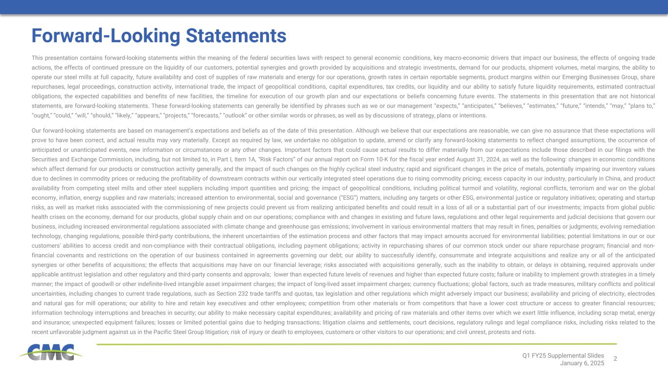 2Q1 FY25 Supplemental Slides January 6, 2025 This presentation contains forward-looking statements within the meaning of the federal securities laws with respect to general economic conditions, key macro-economic drivers that impact our business, the effects of ongoing trade actions, the effects of continued pressure on the liquidity of our customers, potential synergies and growth provided by acquisitions and strategic investments, demand for our products, shipment volumes, metal margins, the ability to operate our steel mills at full capacity, future availability and cost of supplies of raw materials and energy for our operations, growth rates in certain reportable segments, product margins within our Emerging Businesses Group, share repurchases, legal proceedings, construction activity, international trade, the impact of geopolitical conditions, capital expenditures, tax credits, our liquidity and our ability to satisfy future liquidity requirements, estimated contractual obligations, the expected capabilities and benefits of new facilities, the timeline for execution of our growth plan and our expectations or beliefs concerning future events. The statements in this presentation that are not historical statements, are forward-looking statements. These forward-looking statements can generally be identified by phrases such as we or our management “expects,” “anticipates,” “believes,” “estimates,” “future,” “intends,” “may,” “plans to,” “ought,” “could,” “will,” “should,” “likely,” “appears,” “projects,” “forecasts,” “outlook” or other similar words or phrases, as well as by discussions of strategy, plans or intentions. Our forward-looking statements are based on management’s expectations and beliefs as of the date of this presentation. Although we believe that our expectations are reasonable, we can give no assurance that these expectations will prove to have been correct, and actual results may vary materially. Except as required by law, we undertake no obligation to update, amend or clarify any forward-looking statements to reflect changed assumptions, the occurrence of anticipated or unanticipated events, new information or circumstances or any other changes. Important factors that could cause actual results to differ materially from our expectations include those described in our filings with the Securities and Exchange Commission, including, but not limited to, in Part I, Item 1A, “Risk Factors” of our annual report on Form 10-K for the fiscal year ended August 31, 2024, as well as the following: changes in economic conditions which affect demand for our products or construction activity generally, and the impact of such changes on the highly cyclical steel industry; rapid and significant changes in the price of metals, potentially impairing our inventory values due to declines in commodity prices or reducing the profitability of downstream contracts within our vertically integrated steel operations due to rising commodity pricing; excess capacity in our industry, particularly in China, and product availability from competing steel mills and other steel suppliers including import quantities and pricing; the impact of geopolitical conditions, including political turmoil and volatility, regional conflicts, terrorism and war on the global economy, inflation, energy supplies and raw materials; increased attention to environmental, social and governance (“ESG”) matters, including any targets or other ESG, environmental justice or regulatory initiatives; operating and startup risks, as well as market risks associated with the commissioning of new projects could prevent us from realizing anticipated benefits and could result in a loss of all or a substantial part of our investments; impacts from global public health crises on the economy, demand for our products, global supply chain and on our operations; compliance with and changes in existing and future laws, regulations and other legal requirements and judicial decisions that govern our business, including increased environmental regulations associated with climate change and greenhouse gas emissions; involvement in various environmental matters that may result in fines, penalties or judgments; evolving remediation technology, changing regulations, possible third-party contributions, the inherent uncertainties of the estimation process and other factors that may impact amounts accrued for environmental liabilities; potential limitations in our or our customers' abilities to access credit and non-compliance with their contractual obligations, including payment obligations; activity in repurchasing shares of our common stock under our share repurchase program; financial and non- financial covenants and restrictions on the operation of our business contained in agreements governing our debt; our ability to successfully identify, consummate and integrate acquisitions and realize any or all of the anticipated synergies or other benefits of acquisitions; the effects that acquisitions may have on our financial leverage; risks associated with acquisitions generally, such as the inability to obtain, or delays in obtaining, required approvals under applicable antitrust legislation and other regulatory and third-party consents and approvals; lower than expected future levels of revenues and higher than expected future costs; failure or inability to implement growth strategies in a timely manner; the impact of goodwill or other indefinite-lived intangible asset impairment charges; the impact of long-lived asset impairment charges; currency fluctuations; global factors, such as trade measures, military conflicts and political uncertainties, including changes to current trade regulations, such as Section 232 trade tariffs and quotas, tax legislation and other regulations which might adversely impact our business; availability and pricing of electricity, electrodes and natu