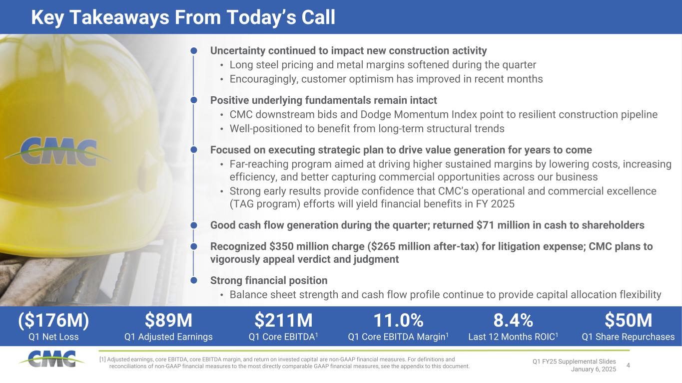4 Uncertainty continued to impact new construction activity • Long steel pricing and metal margins softened during the quarter • Encouragingly, customer optimism has improved in recent months Positive underlying fundamentals remain intact • CMC downstream bids and Dodge Momentum Index point to resilient construction pipeline • Well-positioned to benefit from long-term structural trends Focused on executing strategic plan to drive value generation for years to come • Far-reaching program aimed at driving higher sustained margins by lowering costs, increasing efficiency, and better capturing commercial opportunities across our business • Strong early results provide confidence that CMC’s operational and commercial excellence (TAG program) efforts will yield financial benefits in FY 2025 Good cash flow generation during the quarter; returned $71 million in cash to shareholders Recognized $350 million charge ($265 million after-tax) for litigation expense; CMC plans to vigorously appeal verdict and judgment Strong financial position • Balance sheet strength and cash flow profile continue to provide capital allocation flexibility Q1 FY25 Supplemental Slides January 6, 2025 [1] Adjusted earnings, core EBITDA, core EBITDA margin, and return on invested capital are non-GAAP financial measures. For definitions and reconciliations of non-GAAP financial measures to the most directly comparable GAAP financial measures, see the appendix to this document. ($176M) Q1 Net Loss $89M Q1 Adjusted Earnings $211M Q1 Core EBITDA1 11.0% Q1 Core EBITDA Margin1 8.4% Last 12 Months ROIC1 $50M Q1 Share Repurchases Key Takeaways From Today’s Call