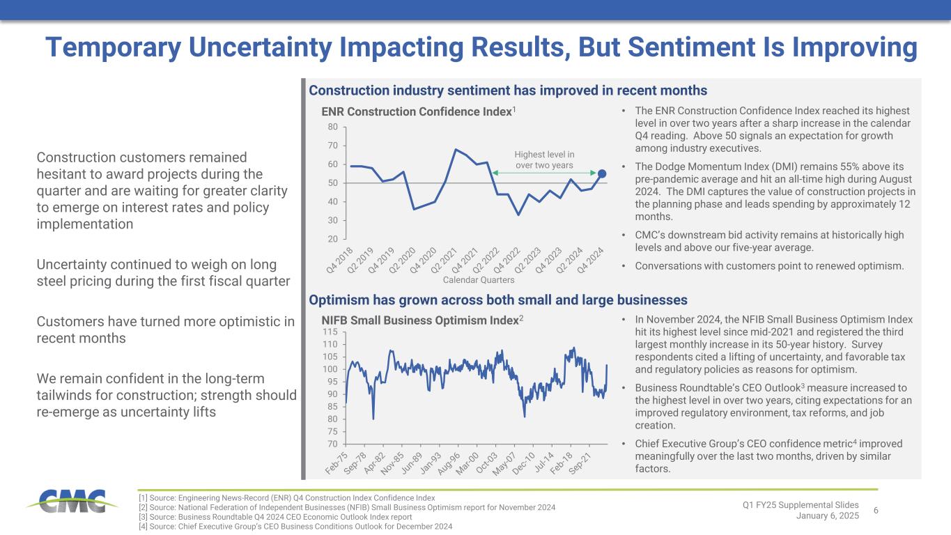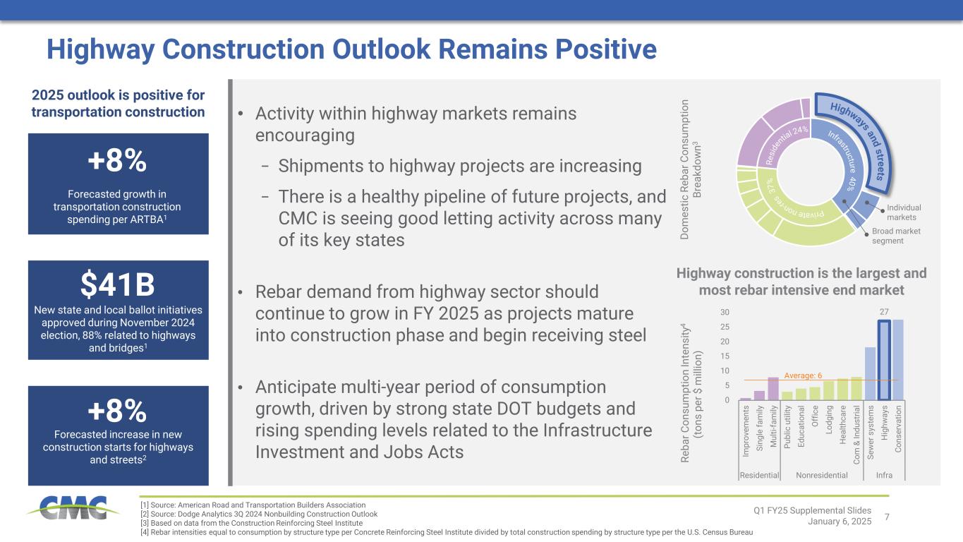 6 Temporary Uncertainty Impacting Results, But Sentiment Is Improving Construction industry sentiment has improved in recent months Q1 FY25 Supplemental Slides January 6, 2025 20 30 40 50 60 70 80 ENR Construction Confidence Index1 • The ENR Construction Confidence Index reached its highest level in over two years after a sharp increase in the calendar Q4 reading. Above 50 signals an expectation for growth among industry executives. • The Dodge Momentum Index (DMI) remains 55% above its pre-pandemic average and hit an all-time high during August 2024. The DMI captures the value of construction projects in the planning phase and leads spending by approximately 12 months. • CMC’s downstream bid activity remains at historically high levels and above our five-year average. • Conversations with customers point to renewed optimism. Highest level in over two years 70 75 80 85 90 95 100 105 110 115 NIFB Small Business Optimism Index2 Optimism has grown across both small and large businesses • In November 2024, the NFIB Small Business Optimism Index hit its highest level since mid-2021 and registered the third largest monthly increase in its 50-year history. Survey respondents cited a lifting of uncertainty, and favorable tax and regulatory policies as reasons for optimism. • Business Roundtable’s CEO Outlook3 measure increased to the highest level in over two years, citing expectations for an improved regulatory environment, tax reforms, and job creation. • Chief Executive Group’s CEO confidence metric4 improved meaningfully over the last two months, driven by similar factors. Construction customers remained hesitant to award projects during the quarter and are waiting for greater clarity to emerge on interest rates and policy implementation Uncertainty continued to weigh on long steel pricing during the first fiscal quarter Customers have turned more optimistic in recent months We remain confident in the long-term tailwinds for construction; strength should re-emerge as uncertainty lifts [1] Source: Engineering News-Record (ENR) Q4 Construction Index Confidence Index [2] Source: National Federation of Independent Businesses (NFIB) Small Business Optimism report for November 2024 [3] Source: Business Roundtable Q4 2024 CEO Economic Outlook Index report [4] Source: Chief Executive Group’s CEO Business Conditions Outlook for December 2024 Calendar Quarters