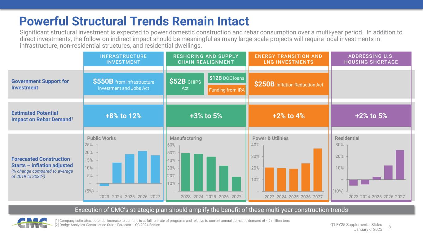 7 Infrastructu re 4 0 % Privatenon-re s 3 7 % R e si de ntia l 24% Highways and stre e ts Individual markets Broad market segmentD o m e s ti c R e b a r C o n s u m p ti o n B re a k d o w n 3 Highway Construction Outlook Remains Positive Q1 FY25 Supplemental Slides January 6, 2025 27 0 5 10 15 20 25 30 Im p ro ve m e n ts S in g le f a m ily M u lt i- fa m ily P u b lic u ti lit y E d u c a ti o n a l O ff ic e L o d g in g H e a lt h c a re C o m & I n d u s tr ia l S e w e r s ys te m s H ig h w a ys C o n s e rv a ti o n Residential Nonresidential Infra R e b a r C o n s u m p ti o n In te n s it y4 (t o n s p e r $ m ill io n ) Average: 6 +8% Forecasted growth in transportation construction spending per ARTBA1 $41B New state and local ballot initiatives approved during November 2024 election, 88% related to highways and bridges1 +8% Forecasted increase in new construction starts for highways and streets2 Highway construction is the largest and most rebar intensive end market 2025 outlook is positive for transportation construction [1] Source: American Road and Transportation Builders Association [2] Source: Dodge Analytics 3Q 2024 Nonbuilding Construction Outlook [3] Based on data from the Construction Reinforcing Steel Institute [4] Rebar intensities equal to consumption by structure type per Concrete Reinforcing Steel Institute divided by total construction spending by structure type per the U.S. Census Bureau • Activity within highway markets remains encouraging − Shipments to highway projects are increasing − There is a healthy pipeline of future projects, and CMC is seeing good letting activity across many of its key states • Rebar demand from highway sector should continue to grow in FY 2025 as projects mature into construction phase and begin receiving steel • Anticipate multi-year period of consumption growth, driven by strong state DOT budgets and rising spending levels related to the Infrastructure Investment and Jobs Acts