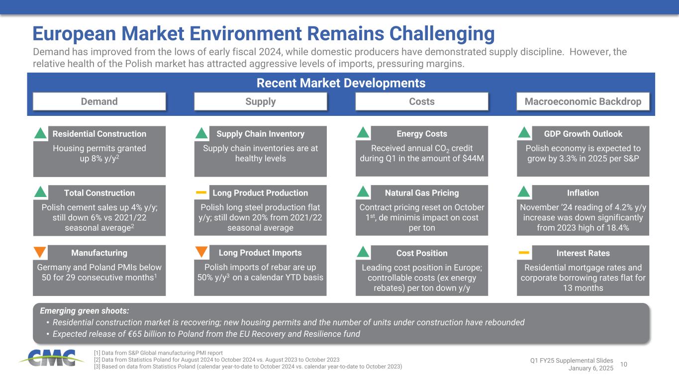 9 The Path Ahead – Running and Growing a Great Business Q1 FY25 Supplemental Slides January 6, 2025 • Focus on people to ensure safety and provide talent development opportunities • Enact operational and commercial excellence (TAG program) efforts that span all levels of the enterprise • Drive to achieve sustainably higher, less volatile, through-the-cycle margins Running a Great Business • Successful commissioning of micro mill projects; capture available internal synergies • Investment to support growth in high margin proprietary solutions • Investment in automation and efficiency gains, including to support operational and commercial excellence efforts Value Accretive Organic Growth • Broaden CMC’s commercial portfolio and improve customer value proposition through expansion into adjacent markets • Strengthen existing business through commercial synergies or internal demand pull • Meaningfully extend CMC’s growth runway Capability Enhancing Inorganic Growth Following the strategic transformation of the last decade, CMC is charting the course for its next phase of growth