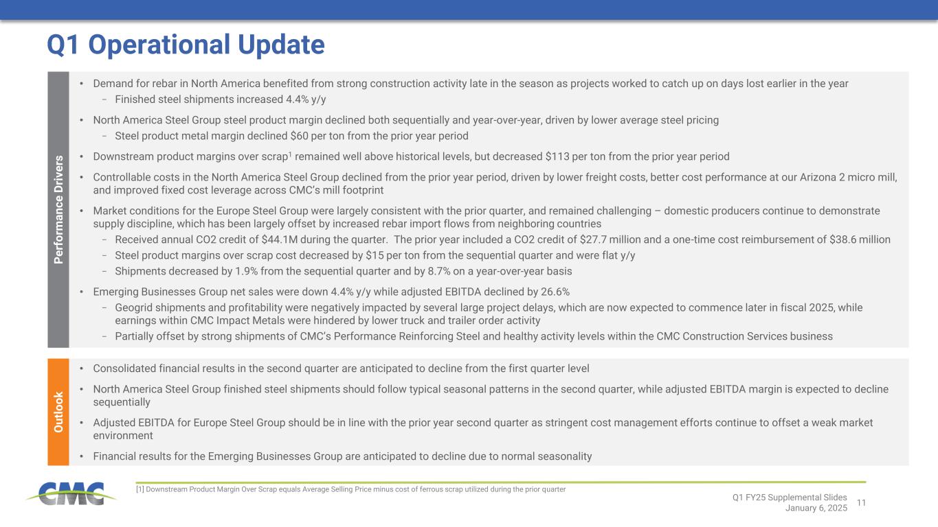10 GDP Growth Outlook Polish economy is expected to grow by 3.3% in 2025 per S&P Recent Market Developments European Market Environment Remains Challenging [1] Data from S&P Global manufacturing PMI report [2] Data from Statistics Poland for August 2024 to October 2024 vs. August 2023 to October 2023 [3] Based on data from Statistics Poland (calendar year-to-date to October 2024 vs. calendar year-to-date to October 2023) Emerging green shoots: • Residential construction market is recovering; new housing permits and the number of units under construction have rebounded • Expected release of €65 billion to Poland from the EU Recovery and Resilience fund Demand has improved from the lows of early fiscal 2024, while domestic producers have demonstrated supply discipline. However, the relative health of the Polish market has attracted aggressive levels of imports, pressuring margins. Demand Supply Costs Macroeconomic Backdrop Manufacturing Germany and Poland PMIs below 50 for 29 consecutive months1 Energy Costs Received annual CO2 credit during Q1 in the amount of $44M Natural Gas Pricing Contract pricing reset on October 1st, de minimis impact on cost per ton Cost Position Leading cost position in Europe; controllable costs (ex energy rebates) per ton down y/y Inflation November ’24 reading of 4.2% y/y increase was down significantly from 2023 high of 18.4% Q1 FY25 Supplemental Slides January 6, 2025 Residential Construction Housing permits granted up 8% y/y2 Long Product Imports Polish imports of rebar are up 50% y/y3 on a calendar YTD basis Total Construction Polish cement sales up 4% y/y; still down 6% vs 2021/22 seasonal average2 Long Product Production Polish long steel production flat y/y; still down 20% from 2021/22 seasonal average Interest Rates Residential mortgage rates and corporate borrowing rates flat for 13 months Supply Chain Inventory Supply chain inventories are at healthy levels