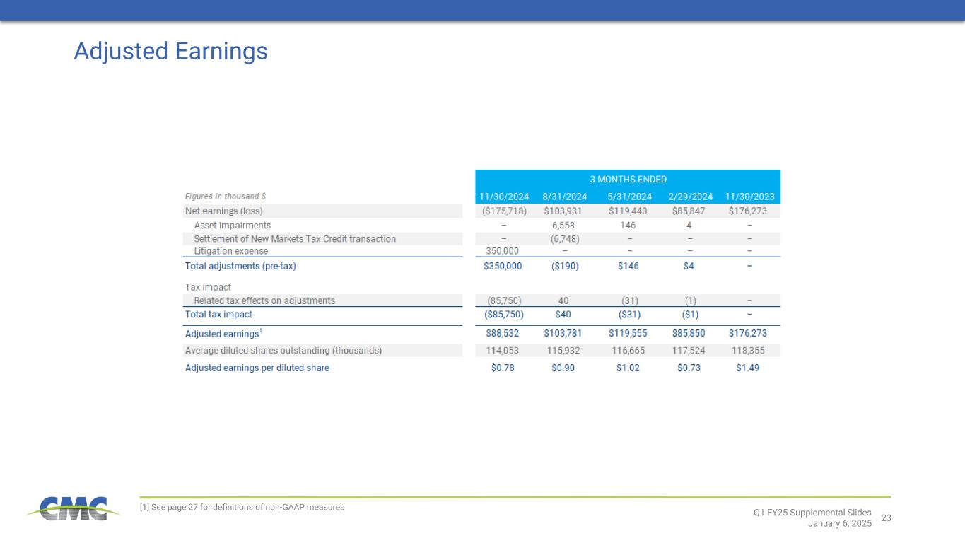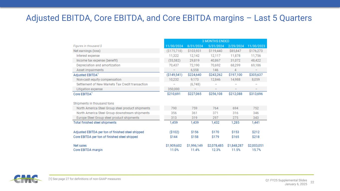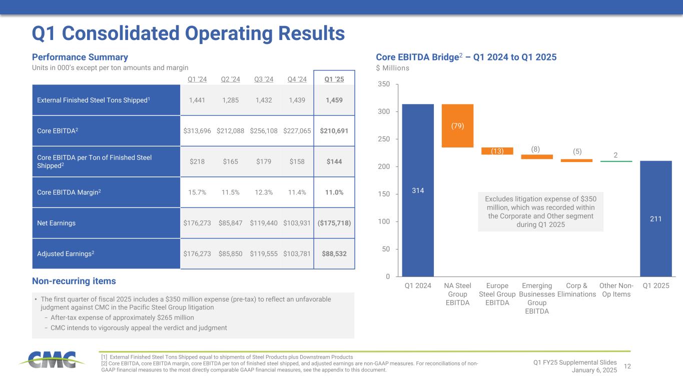 12 314 211 (79) (13) (8) (5) 2 0 50 100 150 200 250 300 350 Q1 2024 NA Steel Group EBITDA Europe Steel Group EBITDA Emerging Businesses Group EBITDA Corp & Eliminations Other Non- Op Items Q1 2025 Q1 Consolidated Operating Results Q1 ’24 Q2 ’24 Q3 ’24 Q4 ’24 Q1 ’25 External Finished Steel Tons Shipped1 1,441 1,285 1,432 1,439 1,459 Core EBITDA2 $313,696 $212,088 $256,108 $227,065 $210,691 Core EBITDA per Ton of Finished Steel Shipped2 $218 $165 $179 $158 $144 Core EBITDA Margin2 15.7% 11.5% 12.3% 11.4% 11.0% Net Earnings $176,273 $85,847 $119,440 $103,931 ($175,718) Adjusted Earnings2 $176,273 $85,850 $119,555 $103,781 $88,532 Performance Summary Units in 000’s except per ton amounts and margin • The first quarter of fiscal 2025 includes a $350 million expense (pre-tax) to reflect an unfavorable judgment against CMC in the Pacific Steel Group litigation − After-tax expense of approximately $265 million − CMC intends to vigorously appeal the verdict and judgment Non-recurring items [1] External Finished Steel Tons Shipped equal to shipments of Steel Products plus Downstream Products [2] Core EBITDA, core EBITDA margin, core EBITDA per ton of finished steel shipped, and adjusted earnings are non-GAAP measures. For reconciliations of non- GAAP financial measures to the most directly comparable GAAP financial measures, see the appendix to this document. Core EBITDA Bridge2 – Q1 2024 to Q1 2025 $ Millions Q1 FY25 Supplemental Slides January 6, 2025 Excludes litigation expense of $350 million, which was recorded within the Corporate and Other segment during Q1 2025