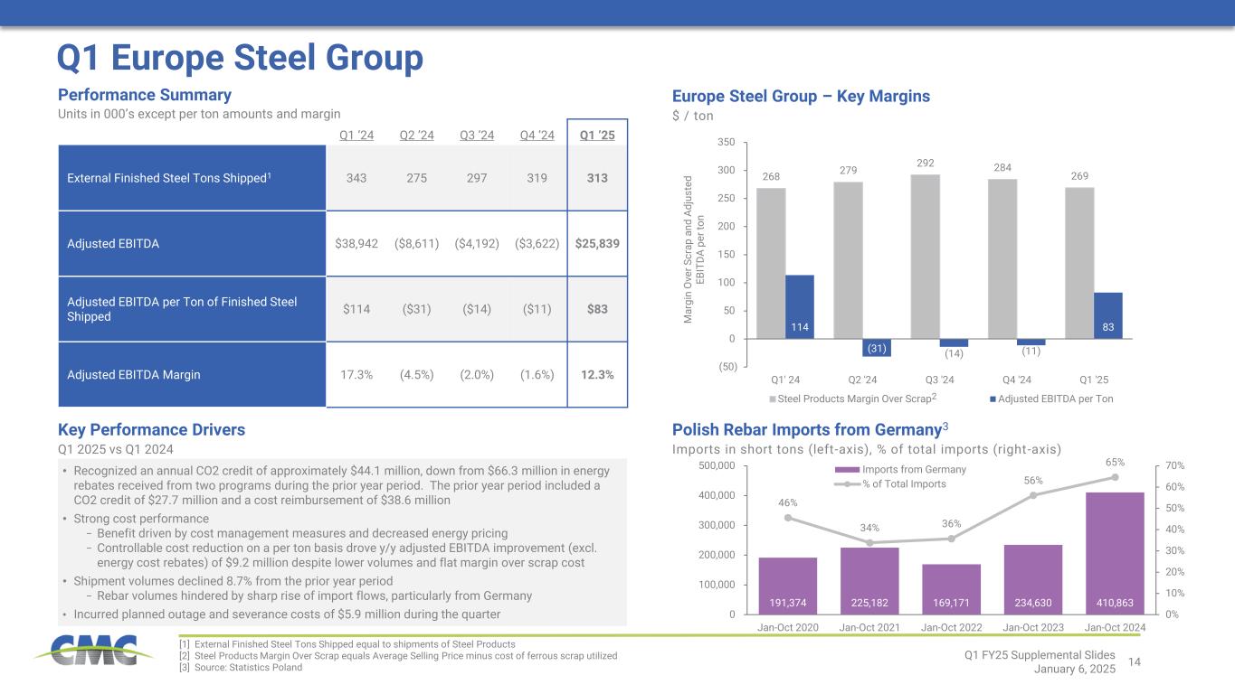 13 243 164 (12) (40) (40) 13 100 125 150 175 200 225 250 Q1 '24 Adj EBITDA per Ton Raw Materials Steel Products Downstream Other Q1 '25 Adj EBITDA per Ton 243 220 217 188 164 1,051 1,015 951 958 938 549 526 538 522 489 0 50 100 150 200 250 300 0 200 400 600 800 1,000 1,200 Q1' 24 Q2 '24 Q3 '24 Q4 '24 Q1 '25 Adjusted EBITDA per Ton of Finished Steel Shipped Downstream Product Margin Over Scrap (1 Qtr Lag) Steel Product Margin Over Scrap Key Performance Drivers Q1 2025 vs Q1 2024 Q1 North America Steel Group Q1 ’24 Q2 ’24 Q3 ’24 Q4 ’24 Q1 ’25 External Finished Steel Tons Shipped1 1,098 1,010 1,135 1,120 1,146 Adjusted EBITDA $266,820 $222,294 $246,304 $210,932 $188,205 Adjusted EBITDA per Ton of Finished Steel Shipped $243 $220 $217 $188 $164 Adjusted EBITDA Margin 16.8% 15.0% 14.7% 13.5% 12.4% Performance Summary Units in 000’s except per ton amounts and margin • Decline in steel product margins over scrap cost − Down $60 per ton y/y • Downstream product margins2 over scrap cost remained well above historical levels, but declined by approximately $113 per ton from a year ago − Full value chain profitability on sales of downstream products above long-term average • Controllable costs declined from the prior year period, driven by lower freight costs, better cost performance at Arizona 2, and improved fixed cost leverage across CMC’s mill footprint [1] External Finished Steel Tons Shipped equal to shipments of Steel Products plus Downstream Products [2] Downstream Product Margin Over Scrap equals Average Selling Price minus cost of ferrous scrap utilized during the prior quarter [3] Steel Products Margin Over Scrap equals Average Selling Price minus cost of ferrous scrap utilized North America Steel Group – Key Margins $ / ton S P a n d D P M a rg in O ve r S c ra p A d ju s te d E B IT D A p e r to n Adjusted EBITDA Per Ton Bridge – Q1 2024 to Q1 2025 $ / ton of external finished steel shipped 2 3 2 Impact of Volume and Margin Over Scrap Cost Q1 FY25 Supplemental Slides January 6, 2025