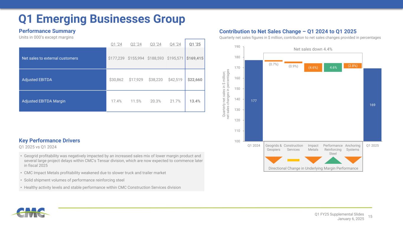 14 191,374 225,182 169,171 234,630 410,863 46% 34% 36% 56% 65% 0% 10% 20% 30% 40% 50% 60% 70% 0 100,000 200,000 300,000 400,000 500,000 Jan-Oct 2020 Jan-Oct 2021 Jan-Oct 2022 Jan-Oct 2023 Jan-Oct 2024 Imports from Germany % of Total Imports 268 279 292 284 269 114 (31) (14) (11) 83 (50) 0 50 100 150 200 250 300 350 Q1' 24 Q2 '24 Q3 '24 Q4 '24 Q1 '25 Steel Products Margin Over Scrap Adjusted EBITDA per Ton Key Performance Drivers Q1 2025 vs Q1 2024 Q1 Europe Steel Group Q1 ’24 Q2 ’24 Q3 ’24 Q4 ’24 Q1 ’25 External Finished Steel Tons Shipped1 343 275 297 319 313 Adjusted EBITDA $38,942 ($8,611) ($4,192) ($3,622) $25,839 Adjusted EBITDA per Ton of Finished Steel Shipped $114 ($31) ($14) ($11) $83 Adjusted EBITDA Margin 17.3% (4.5%) (2.0%) (1.6%) 12.3% Performance Summary Units in 000’s except per ton amounts and margin • Recognized an annual CO2 credit of approximately $44.1 million, down from $66.3 million in energy rebates received from two programs during the prior year period. The prior year period included a CO2 credit of $27.7 million and a cost reimbursement of $38.6 million • Strong cost performance − Benefit driven by cost management measures and decreased energy pricing − Controllable cost reduction on a per ton basis drove y/y adjusted EBITDA improvement (excl. energy cost rebates) of $9.2 million despite lower volumes and flat margin over scrap cost • Shipment volumes declined 8.7% from the prior year period − Rebar volumes hindered by sharp rise of import flows, particularly from Germany • Incurred planned outage and severance costs of $5.9 million during the quarter Europe Steel Group – Key Margins $ / ton Polish Rebar Imports from Germany3 Imports in short tons (left-axis), % of total imports (right-axis) 2 [1] External Finished Steel Tons Shipped equal to shipments of Steel Products [2] Steel Products Margin Over Scrap equals Average Selling Price minus cost of ferrous scrap utilized [3] Source: Statistics Poland M a rg in O ve r S c ra p a n d A d ju s te d E B IT D A p e r to n Q1 FY25 Supplemental Slides January 6, 2025
