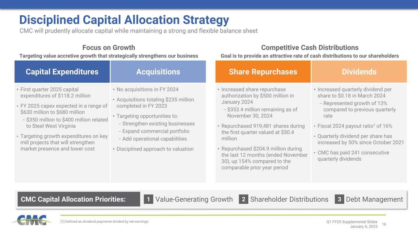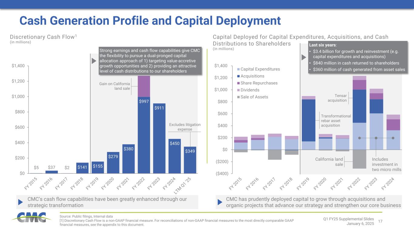16 • First quarter 2025 capital expenditures of $118.2 million • FY 2025 capex expected in a range of $630 million to $680 million − $350 million to $400 million related to Steel West Virginia • Targeting growth expenditures on key mill projects that will strengthen market presence and lower cost Disciplined Capital Allocation Strategy CMC will prudently allocate capital while maintaining a strong and flexible balance sheet Q1 FY25 Supplemental Slides January 6, 2025 [1] Defined as dividend payments divided by net earnings 2 31 Value-Generating Growth Shareholder Distributions Debt ManagementCMC Capital Allocation Priorities: Capital Expenditures Acquisitions Share Repurchases Dividends • No acquisitions in FY 2024 • Acquisitions totaling $235 million completed in FY 2023 • Targeting opportunities to: − Strengthen existing businesses − Expand commercial portfolio − Add operational capabilities • Disciplined approach to valuation • Increased share repurchase authorization by $500 million in January 2024 − $353.4 million remaining as of November 30, 2024 • Repurchased 919,481 shares during the first quarter valued at $50.4 million • Repurchased $204.9 million during the last 12 months (ended November 30), up 154% compared to the comparable prior year period • Increased quarterly dividend per share to $0.18 in March 2024 − Represented growth of 13% compared to previous quarterly rate • Fiscal 2024 payout ratio1 of 16% • Quarterly dividend per share has increased by 50% since October 2021 • CMC has paid 241 consecutive quarterly dividends Focus on Growth Targeting value accretive growth that strategically strengthens our business Competitive Cash Distributions Goal is to provide an attractive rate of cash distributions to our shareholders