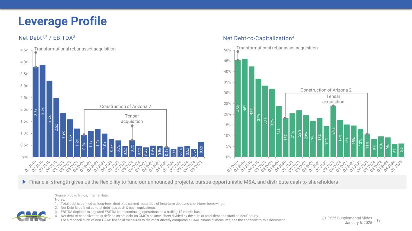 19 3 .8 x 3 .9 x 3 .2 x 2 .5 x 1 .9 x 1 .6 x 1 .2 x 0 .9 x 1 .1 x 1 .2 x 1 .0 x 0 .8 x 0 .7 x 0 .5 x 0 .7 x 0 .5 x 0 .4 x 0 .5 x 0 .5 x 0 .4 x 0 .3 x 0 .4 x 0 .5 x 0 .3 x 0 .6 x NM 0.5x 1.0x 1.5x 2.0x 2.5x 3.0x 3.5x 4.0x 4.5x 4 5 % 4 6 % 4 2 % 3 7 % 3 3 % 3 2 % 2 4 % 1 8 % 2 1 % 2 2 % 2 0 % 1 7 % 1 8 % 1 4 % 2 4 % 1 7 % 1 5 % 1 5 % 1 3 % 1 1 % 8 % 1 0 % 9 % 6 % 6 % 0% 5% 10% 15% 20% 25% 30% 35% 40% 45% 50% Source: Public filings, Internal data Notes: 1. Total debt is defined as long-term debt plus current maturities of long-term debt and short-term borrowings. 2. Net Debt is defined as total debt less cash & cash equivalents. 3. EBITDA depicted is adjusted EBITDA from continuing operations on a trailing 12-month basis 4. Net debt-to-capitalization is defined as net debt on CMC’s balance sheet divided by the sum of total debt and stockholders’ equity. For a reconciliation of non-GAAP financial measures to the most directly comparable GAAP financial measures, see the appendix to this document. Leverage Profile Financial strength gives us the flexibility to fund our announced projects, pursue opportunistic M&A, and distribute cash to shareholders Net Debt1,2 / EBITDA3 Net Debt-to-Capitalization4 Transformational rebar asset acquisition Tensar acquisition Construction of Arizona 2 Transformational rebar asset acquisition Tensar acquisition Construction of Arizona 2 Q1 FY25 Supplemental Slides January 6, 2025
