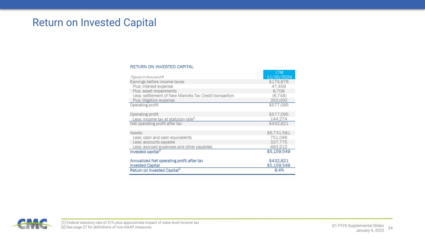 24 Return on Invested Capital [1] Federal statutory rate of 21% plus approximate impact of state level income tax [2] See page 27 for definitions of non-GAAP measures Q1 FY25 Supplemental Slides January 6, 2025