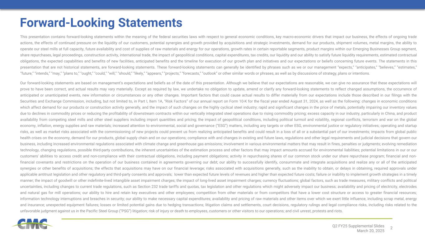 2Q2 FY25 Supplemental Slides March 20, 2025 This presentation contains forward-looking statements within the meaning of the federal securities laws with respect to general economic conditions, key macro-economic drivers that impact our business, the effects of ongoing trade actions, the effects of continued pressure on the liquidity of our customers, potential synergies and growth provided by acquisitions and strategic investments, demand for our products, shipment volumes, metal margins, the ability to operate our steel mills at full capacity, future availability and cost of supplies of raw materials and energy for our operations, growth rates in certain reportable segments, product margins within our Emerging Businesses Group segment, share repurchases, legal proceedings, construction activity, international trade, the impact of geopolitical conditions, capital expenditures, tax credits, our liquidity and our ability to satisfy future liquidity requirements, estimated contractual obligations, the expected capabilities and benefits of new facilities, anticipated benefits and the timeline for execution of our growth plan and initiatives and our expectations or beliefs concerning future events. The statements in this presentation that are not historical statements, are forward-looking statements. These forward-looking statements can generally be identified by phrases such as we or our management “expects,” “anticipates,” “believes,” “estimates,” “future,” “intends,” “may,” “plans to,” “ought,” “could,” “will,” “should,” “likely,” “appears,” “projects,” “forecasts,” “outlook” or other similar words or phrases, as well as by discussions of strategy, plans or intentions. Our forward-looking statements are based on management’s expectations and beliefs as of the date of this presentation. Although we believe that our expectations are reasonable, we can give no assurance that these expectations will prove to have been correct, and actual results may vary materially. Except as required by law, we undertake no obligation to update, amend or clarify any forward-looking statements to reflect changed assumptions, the occurrence of anticipated or unanticipated events, new information or circumstances or any other changes. Important factors that could cause actual results to differ materially from our expectations include those described in our filings with the Securities and Exchange Commission, including, but not limited to, in Part I, Item 1A, “Risk Factors” of our annual report on Form 10-K for the fiscal year ended August 31, 2024, as well as the following: changes in economic conditions which affect demand for our products or construction activity generally, and the impact of such changes on the highly cyclical steel industry; rapid and significant changes in the price of metals, potentially impairing our inventory values due to declines in commodity prices or reducing the profitability of downstream contracts within our vertically integrated steel operations due to rising commodity pricing; excess capacity in our industry, particularly in China, and product availability from competing steel mills and other steel suppliers including import quantities and pricing; the impact of geopolitical conditions, including political turmoil and volatility, regional conflicts, terrorism and war on the global economy, inflation, energy supplies and raw materials; increased attention to environmental, social and governance (“ESG”) matters, including any targets or other ESG, environmental justice or regulatory initiatives; operating and startup risks, as well as market risks associated with the commissioning of new projects could prevent us from realizing anticipated benefits and could result in a loss of all or a substantial part of our investments; impacts from global public health crises on the economy, demand for our products, global supply chain and on our operations; compliance with and changes in existing and future laws, regulations and other legal requirements and judicial decisions that govern our business, including increased environmental regulations associated with climate change and greenhouse gas emissions; involvement in various environmental matters that may result in fines, penalties or judgments; evolving remediation technology, changing regulations, possible third-party contributions, the inherent uncertainties of the estimation process and other factors that may impact amounts accrued for environmental liabilities; potential limitations in our or our customers' abilities to access credit and non-compliance with their contractual obligations, including payment obligations; activity in repurchasing shares of our common stock under our share repurchase program; financial and non- financial covenants and restrictions on the operation of our business contained in agreements governing our debt; our ability to successfully identify, consummate and integrate acquisitions and realize any or all of the anticipated synergies or other benefits of acquisitions; the effects that acquisitions may have on our financial leverage; risks associated with acquisitions generally, such as the inability to obtain, or delays in obtaining, required approvals under applicable antitrust legislation and other regulatory and third-party consents and approvals; lower than expected future levels of revenues and higher than expected future costs; failure or inability to implement growth strategies in a timely manner; the impact of goodwill or other indefinite-lived intangible asset impairment charges; the impact of long-lived asset impairment charges; currency fluctuations; global factors, such as trade measures, military conflicts and political uncertainties, including changes to current trade regulations, such as Section 232 trade tariffs and quotas, tax legislation and other regulations which might adversely impact our business; availability