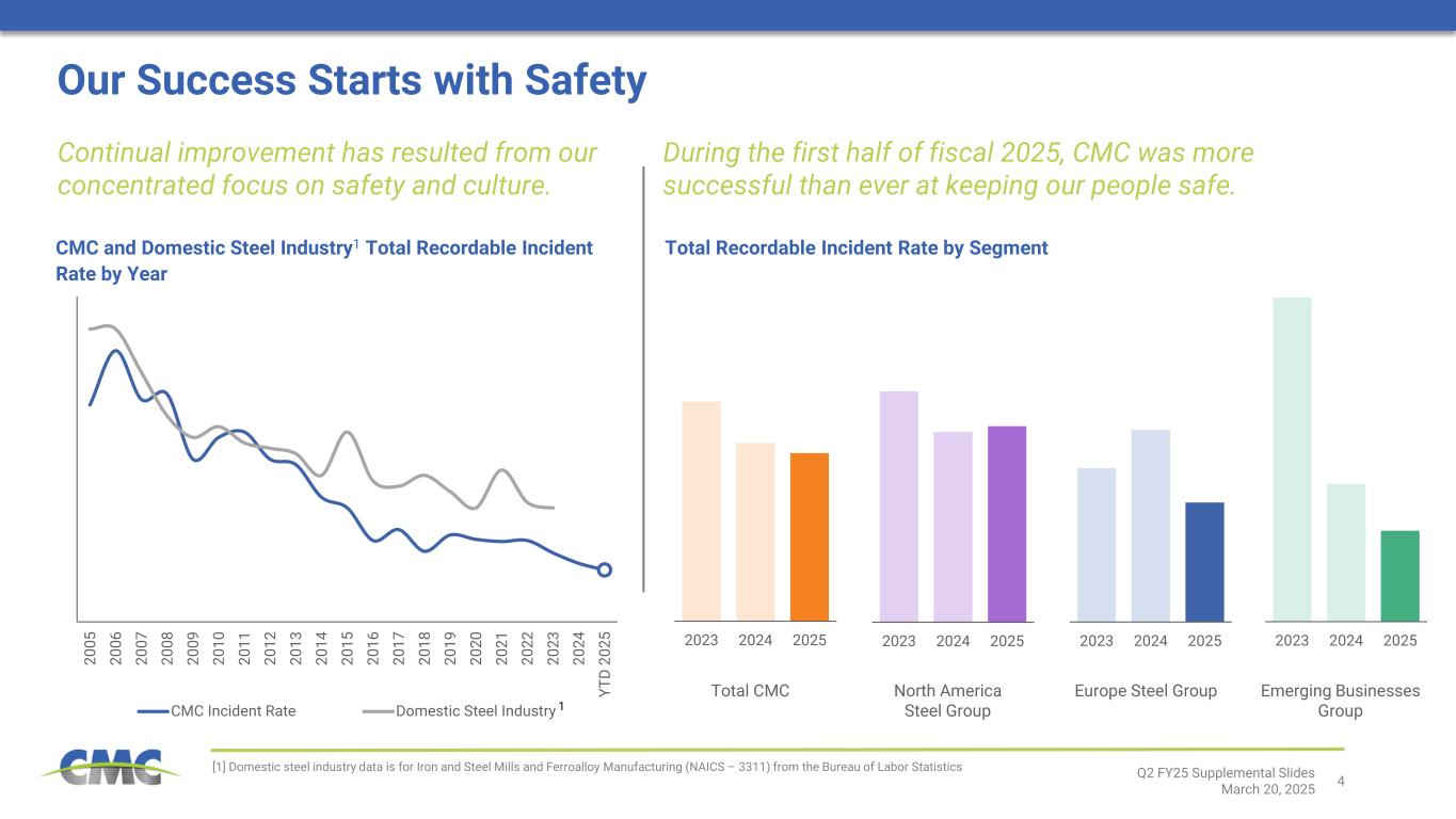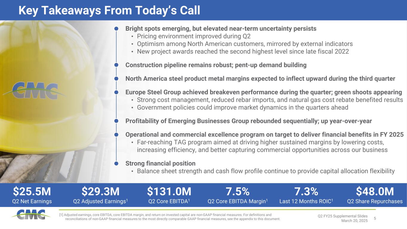 4 20 05 20 06 20 07 20 08 20 09 20 10 20 11 20 12 20 13 20 14 20 15 20 16 20 17 20 18 20 19 20 20 20 21 20 22 20 23 20 24 YT D 20 25 CMC Incident Rate Domestic Steel Industry 1 2023 2024 20252023 2024 20252023 2024 20252023 2024 2025 Our Success Starts with Safety [1] Domestic steel industry data is for Iron and Steel Mills and Ferroalloy Manufacturing (NAICS – 3311) from the Bureau of Labor Statistics CMC and Domestic Steel Industry1 Total Recordable Incident Rate by Year Continual improvement has resulted from our concentrated focus on safety and culture. Total CMC North America Steel Group Europe Steel Group Emerging Businesses Group Total Recordable Incident Rate by Segment During the first half of fiscal 2025, CMC was more successful than ever at keeping our people safe. Q2 FY25 Supplemental Slides March 20, 2025