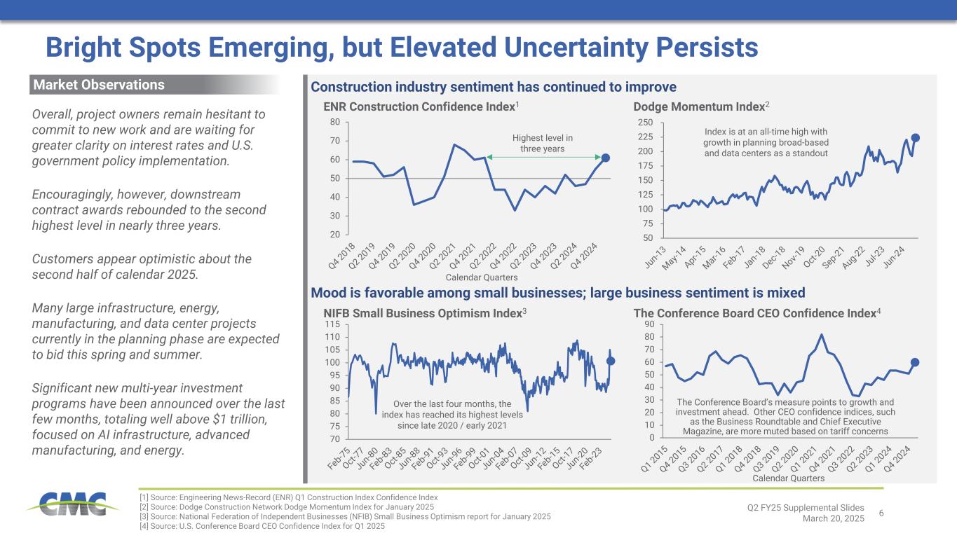 5 Bright spots emerging, but elevated near-term uncertainty persists • Pricing environment improved during Q2 • Optimism among North American customers, mirrored by external indicators • New project awards reached the second highest level since late fiscal 2022 Construction pipeline remains robust; pent-up demand building North America steel product metal margins expected to inflect upward during the third quarter Europe Steel Group achieved breakeven performance during the quarter; green shoots appearing • Strong cost management, reduced rebar imports, and natural gas cost rebate benefited results • Government policies could improve market dynamics in the quarters ahead Profitability of Emerging Businesses Group rebounded sequentially; up year-over-year Operational and commercial excellence program on target to deliver financial benefits in FY 2025 • Far-reaching TAG program aimed at driving higher sustained margins by lowering costs, increasing efficiency, and better capturing commercial opportunities across our business Strong financial position • Balance sheet strength and cash flow profile continue to provide capital allocation flexibility Q2 FY25 Supplemental Slides March 20, 2025 [1] Adjusted earnings, core EBITDA, core EBITDA margin, and return on invested capital are non-GAAP financial measures. For definitions and reconciliations of non-GAAP financial measures to the most directly comparable GAAP financial measures, see the appendix to this document. $25.5M Q2 Net Earnings $29.3M Q2 Adjusted Earnings1 $131.0M Q2 Core EBITDA1 7.5% Q2 Core EBITDA Margin1 7.3% Last 12 Months ROIC1 $48.0M Q2 Share Repurchases Key Takeaways From Today’s Call