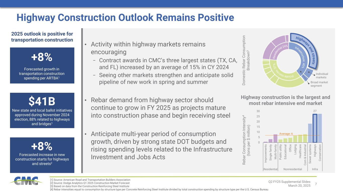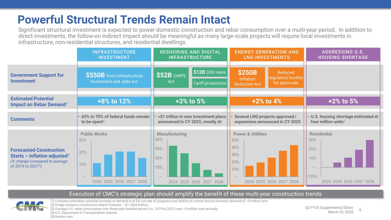 7 Individual markets Broad market segmentDo m es tic R eb ar C on su m pt io n Br ea kd ow n3 Highway Construction Outlook Remains Positive Q2 FY25 Supplemental Slides March 20, 2025 27 0 5 10 15 20 25 30 Im pr ov em en ts Si ng le fa m ily M ul ti- fa m ily Pu bl ic u til ity Ed uc at io na l O ff ic e Lo dg in g H ea lth ca re Co m & In du st ria l Se w er s ys te m s H ig hw ay s Co ns er va tio n Residential Nonresidential Infra Re ba r C on su m pt io n In te ns ity 4 (t on s pe r $ m ill io n) Average: 6 +8% Forecasted growth in transportation construction spending per ARTBA1 $41B New state and local ballot initiatives approved during November 2024 election, 88% related to highways and bridges1 +8% Forecasted increase in new construction starts for highways and streets2 Highway construction is the largest and most rebar intensive end market 2025 outlook is positive for transportation construction [1] Source: American Road and Transportation Builders Association [2] Source: Dodge Analytics Q1 2025 Construction Market Forecast [3] Based on data from the Construction Reinforcing Steel Institute [4] Rebar intensities equal to consumption by structure type per Concrete Reinforcing Steel Institute divided by total construction spending by structure type per the U.S. Census Bureau • Activity within highway markets remains encouraging − Contract awards in CMC’s three largest states (TX, CA, and FL) increased by an average of 15% in CY 2024 − Seeing other markets strengthen and anticipate solid pipeline of new work in spring and summer • Rebar demand from highway sector should continue to grow in FY 2025 as projects mature into construction phase and begin receiving steel • Anticipate multi-year period of consumption growth, driven by strong state DOT budgets and rising spending levels related to the Infrastructure Investment and Jobs Acts