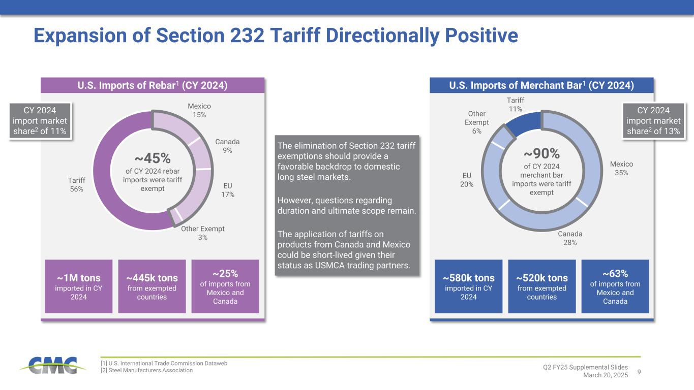 8 Comments Forecasted Construction Starts – inflation adjusted2 (% change compared to average of 2019 to 20213) (10%) – 10% 20% 30% 2024 2025 2026 2027 2028 – 10% 20% 30% 40% 50% 2024 2025 2026 2027 2028 – 10% 20% 30% 40% 2024 2025 2026 2027 2028 – 10% 20% 30% 2024 2025 2026 2027 2028 Estimated Potential Impact on Rebar Demand1 Government Support for Investment Powerful Structural Trends Remain Intact RESHORING AND DIGITAL INFRASTRUCTURE ENERGY GENERATION AND LNG INVESTMENTS Significant structural investment is expected to power domestic construction and rebar consumption over a multi-year period. In addition to direct investments, the follow-on indirect impact should be meaningful as many large-scale projects will require local investments in infrastructure, non-residential structures, and residential dwellings. [1] Company estimates; potential increase to demand is at full run-rate of programs and relative to current annual domestic demand of ~9 million tons [2] Dodge Analytics Construction Starts Forecast – Q1 2025 Edition [3] Average U.S. rebar consumption over three-year baseline period (i.e., 2019 to 2021) was ~9 million tons annually [4] U.S. Department of Transportation website [5] Realtor.com INFRASTRUCTURE INVESTMENT $550B from Infrastructure Investment and Jobs Act $52B CHIPS Act $250B Inflation Reduction Act $12B DOE loans Tariff protections Q2 FY25 Supplemental Slides March 20, 2025 +8% to 12% +3% to 5% +2% to 4% Public Works Manufacturing Power & Utilities Execution of CMC’s strategic plan should amplify the benefit of these multi-year construction trends ADDRESSING U.S. HOUSING SHORTAGE +2% to 5% Residential Reduced regulatory hurdles for approvals • 65% to 70% of federal funds remain to be spent4 • >$1 trillion in new investment plans announced in CY 2025, mostly AI • Several LNG projects approved / expansions announced in CY 2025 • U.S. housing shortage estimated at four million units5