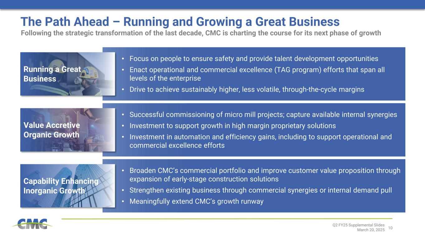 9 Mexico 15% Canada 9% EU 17% Other Exempt 3% Tariff 56% Mexico 35% Canada 28% EU 20% Other Exempt 6% Tariff 11% Expansion of Section 232 Tariff Directionally Positive Q2 FY25 Supplemental Slides March 20, 2025 ~45% of CY 2024 rebar imports were tariff exempt ~90% of CY 2024 merchant bar imports were tariff exempt U.S. Imports of Rebar1 (CY 2024) U.S. Imports of Merchant Bar1 (CY 2024) The elimination of Section 232 tariff exemptions should provide a favorable backdrop to domestic long steel markets. However, questions regarding duration and ultimate scope remain. The application of tariffs on products from Canada and Mexico could be short-lived given their status as USMCA trading partners. CY 2024 import market share2 of 11% CY 2024 import market share2 of 13% ~1M tons imported in CY 2024 ~445k tons from exempted countries ~25% of imports from Mexico and Canada ~580k tons imported in CY 2024 ~520k tons from exempted countries ~63% of imports from Mexico and Canada [1] U.S. International Trade Commission Dataweb [2] Steel Manufacturers Association