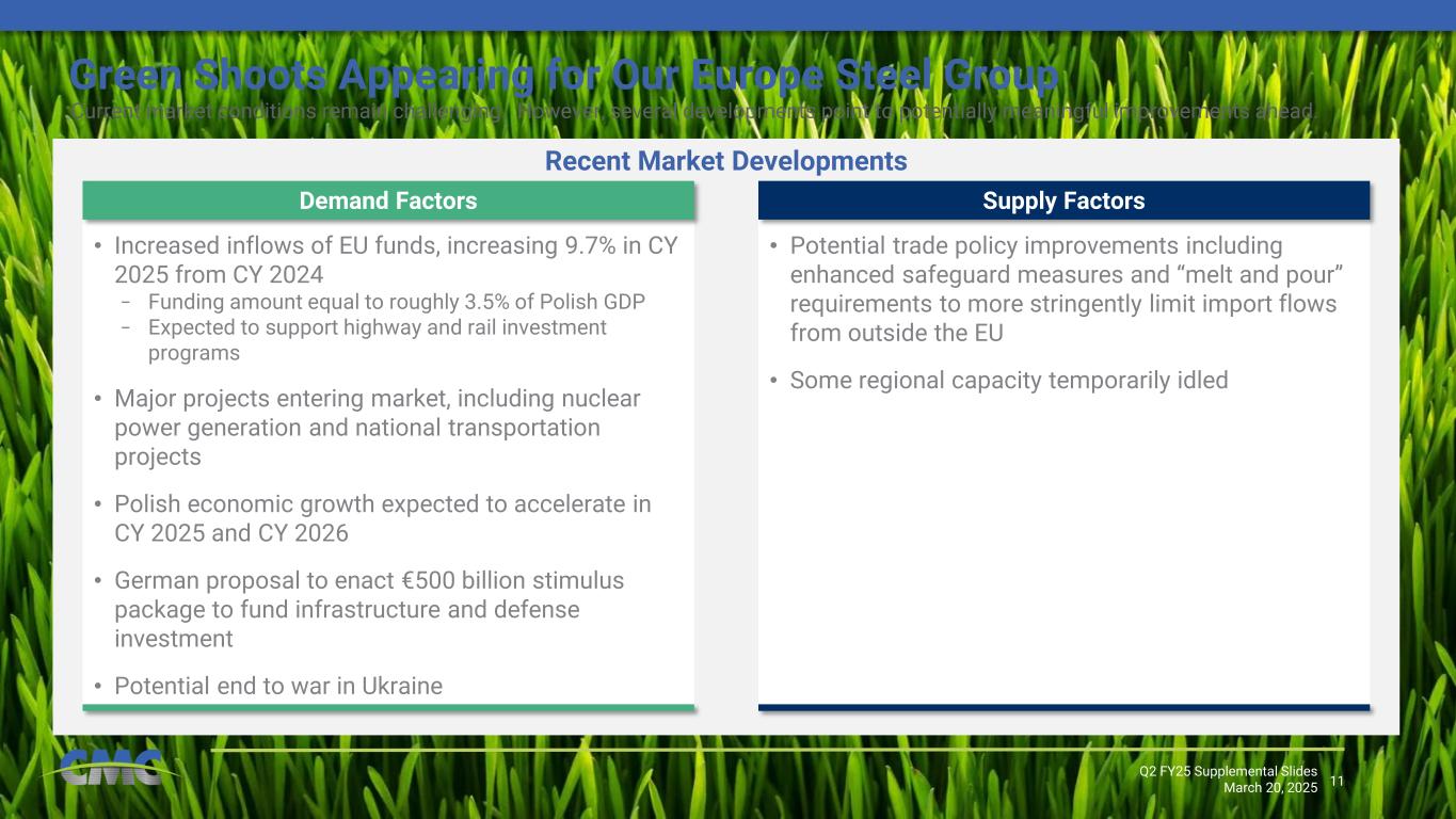 10 The Path Ahead – Running and Growing a Great Business Q2 FY25 Supplemental Slides March 20, 2025 • Focus on people to ensure safety and provide talent development opportunities • Enact operational and commercial excellence (TAG program) efforts that span all levels of the enterprise • Drive to achieve sustainably higher, less volatile, through-the-cycle margins Running a Great Business • Successful commissioning of micro mill projects; capture available internal synergies • Investment to support growth in high margin proprietary solutions • Investment in automation and efficiency gains, including to support operational and commercial excellence efforts Value Accretive Organic Growth • Broaden CMC’s commercial portfolio and improve customer value proposition through expansion of early-stage construction solutions • Strengthen existing business through commercial synergies or internal demand pull • Meaningfully extend CMC’s growth runway Capability Enhancing Inorganic Growth Following the strategic transformation of the last decade, CMC is charting the course for its next phase of growth