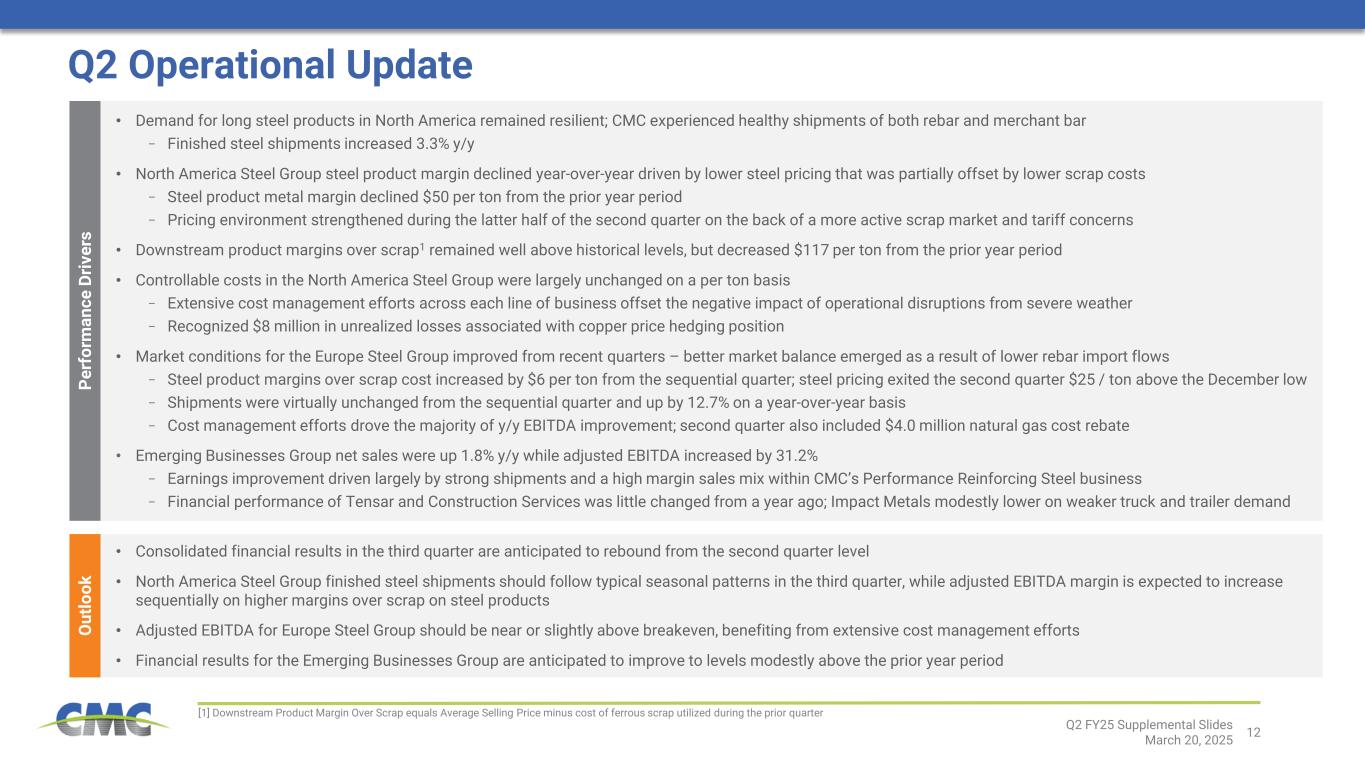 11 Recent Market Developments • Increased inflows of EU funds, increasing 9.7% in CY 2025 from CY 2024 − Funding amount equal to roughly 3.5% of Polish GDP − Expected to support highway and rail investment programs • Major projects entering market, including nuclear power generation and national transportation projects • Polish economic growth expected to accelerate in CY 2025 and CY 2026 • German proposal to enact €500 billion stimulus package to fund infrastructure and defense investment • Potential end to war in Ukraine Green Shoots Appearing for Our Europe Steel Group • Potential trade policy improvements including enhanced safeguard measures and “melt and pour” requirements to more stringently limit import flows from outside the EU • Some regional capacity temporarily idled Current market conditions remain challenging. However, several developments point to potentially meaningful improvements ahead. Demand Factors Supply Factors Q2 FY25 Supplemental Slides March 20, 2025