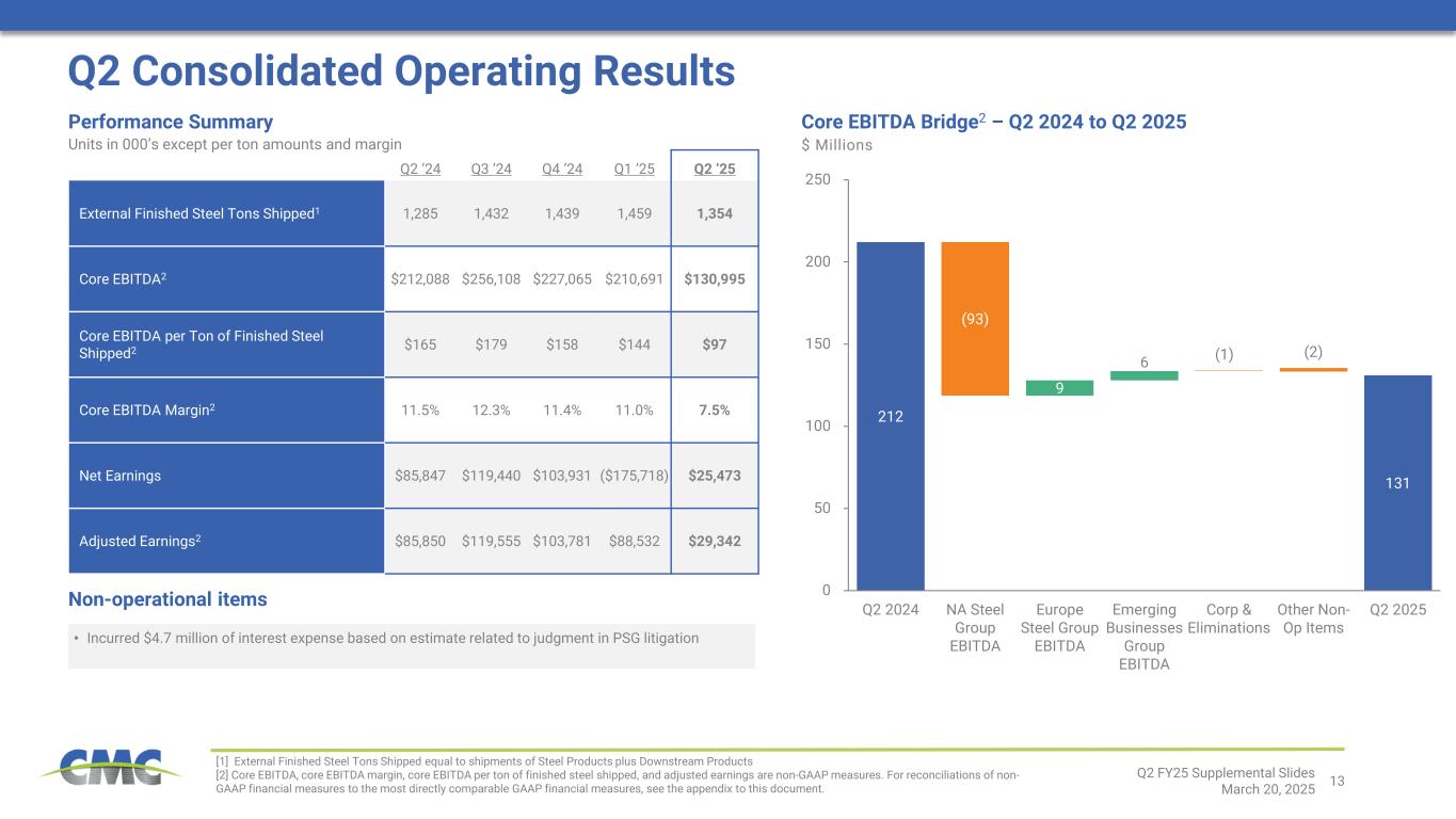 12 • Consolidated financial results in the third quarter are anticipated to rebound from the second quarter level • North America Steel Group finished steel shipments should follow typical seasonal patterns in the third quarter, while adjusted EBITDA margin is expected to increase sequentially on higher margins over scrap on steel products • Adjusted EBITDA for Europe Steel Group should be near or slightly above breakeven, benefiting from extensive cost management efforts • Financial results for the Emerging Businesses Group are anticipated to improve to levels modestly above the prior year period • Demand for long steel products in North America remained resilient; CMC experienced healthy shipments of both rebar and merchant bar − Finished steel shipments increased 3.3% y/y • North America Steel Group steel product margin declined year-over-year driven by lower steel pricing that was partially offset by lower scrap costs − Steel product metal margin declined $50 per ton from the prior year period − Pricing environment strengthened during the latter half of the second quarter on the back of a more active scrap market and tariff concerns • Downstream product margins over scrap1 remained well above historical levels, but decreased $117 per ton from the prior year period • Controllable costs in the North America Steel Group were largely unchanged on a per ton basis − Extensive cost management efforts across each line of business offset the negative impact of operational disruptions from severe weather − Recognized $8 million in unrealized losses associated with copper price hedging position • Market conditions for the Europe Steel Group improved from recent quarters – better market balance emerged as a result of lower rebar import flows − Steel product margins over scrap cost increased by $6 per ton from the sequential quarter; steel pricing exited the second quarter $25 / ton above the December low − Shipments were virtually unchanged from the sequential quarter and up by 12.7% on a year-over-year basis − Cost management efforts drove the majority of y/y EBITDA improvement; second quarter also included $4.0 million natural gas cost rebate • Emerging Businesses Group net sales were up 1.8% y/y while adjusted EBITDA increased by 31.2% − Earnings improvement driven largely by strong shipments and a high margin sales mix within CMC’s Performance Reinforcing Steel business − Financial performance of Tensar and Construction Services was little changed from a year ago; Impact Metals modestly lower on weaker truck and trailer demand Pe rf or m an ce D riv er s O ut lo ok Q2 Operational Update [1] Downstream Product Margin Over Scrap equals Average Selling Price minus cost of ferrous scrap utilized during the prior quarter Q2 FY25 Supplemental Slides March 20, 2025