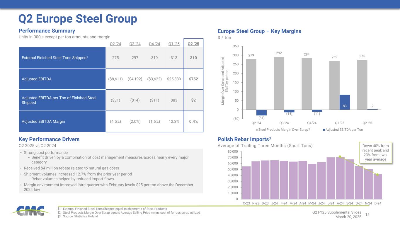14 220 123 (4) (28) (61) (3) 0 50 100 150 200 250 Q2 '24 Adj EBITDA per Ton Raw Materials Steel Products Downstream Other Q2 '25 Adj EBITDA per Ton 220 217 188 164 123 1,015 951 958 938 898 526 538 522 489 476 0 50 100 150 200 250 300 0 200 400 600 800 1,000 1,200 Q2 '24 Q3 '24 Q4 '24 Q1 '25 Q2 '25 Adjusted EBITDA per Ton of Finished Steel Shipped Downstream Product Margin Over Scrap (1 Qtr Lag) Steel Product Margin Over Scrap Key Performance Drivers Q2 2025 vs Q2 2024 Q2 North America Steel Group Q2 ’24 Q3 ’24 Q4 ’24 Q1 ’25 Q2 ’25 External Finished Steel Tons Shipped1 1,010 1,135 1,120 1,146 1,044 Adjusted EBITDA $222,294 $246,304 $210,932 $188,205 $128,818 Adjusted EBITDA per Ton of Finished Steel Shipped $220 $217 $188 $164 $123 Adjusted EBITDA Margin 15.0% 14.7% 13.5% 12.4% 9.3% Performance Summary Units in 000’s except per ton amounts and margin • Decline in steel product margins over scrap cost − Down $50 per ton y/y • Downstream product margins2 over scrap cost remained well above historical levels, but declined by approximately $117 per ton from a year ago − Full value chain profitability on sales of downstream products above long-term average • Controllable costs per ton of finished steel shipped were roughly flat on a year-over-year basis as successful cost management efforts offset challenges related to weather related operational disruptions • Second quarter results included unrealized losses of approximately $8 million related to copper hedging positions [1] External Finished Steel Tons Shipped equal to shipments of Steel Products plus Downstream Products [2] Downstream Product Margin Over Scrap equals Average Selling Price minus cost of ferrous scrap utilized during the prior quarter [3] Steel Products Margin Over Scrap equals Average Selling Price minus cost of ferrous scrap utilized North America Steel Group – Key Margins $ / ton SP a nd D P M ar gi n O ve r S cr ap Adjusted EBITDA per ton Adjusted EBITDA Per Ton Bridge – Q2 2024 to Q2 2025 $ / ton of external finished steel shipped 2 3 2 Impact of Volume and Margin Over Scrap Cost Q2 FY25 Supplemental Slides March 20, 2025
