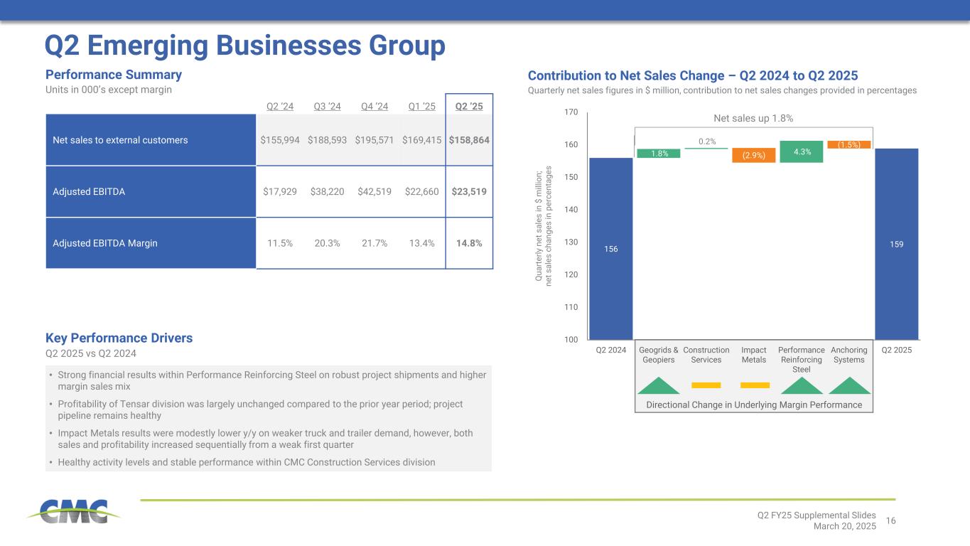 15 0 10,000 20,000 30,000 40,000 50,000 60,000 70,000 80,000 O-23 N-23 D-23 J-24 F-24 M-24 A-24 M-24 J-24 J-24 A-24 S-24 O-24 N-24 D-24 279 292 284 269 275 (31) (14) (11) 83 2 (50) 0 50 100 150 200 250 300 350 Q2 '24 Q3 '24 Q4 '24 Q1 '25 Q2 '25 Steel Products Margin Over Scrap Adjusted EBITDA per Ton Key Performance Drivers Q2 2025 vs Q2 2024 Q2 Europe Steel Group Q2 ’24 Q3 ’24 Q4 ’24 Q1 ’25 Q2 ’25 External Finished Steel Tons Shipped1 275 297 319 313 310 Adjusted EBITDA ($8,611) ($4,192) ($3,622) $25,839 $752 Adjusted EBITDA per Ton of Finished Steel Shipped ($31) ($14) ($11) $83 $2 Adjusted EBITDA Margin (4.5%) (2.0%) (1.6%) 12.3% 0.4% Performance Summary Units in 000’s except per ton amounts and margin • Strong cost performance − Benefit driven by a combination of cost management measures across nearly every major category • Received $4 million rebate related to natural gas costs • Shipment volumes increased 12.7% from the prior year period − Rebar volumes helped by reduced import flows • Margin environment improved intra-quarter with February levels $25 per ton above the December 2024 low Europe Steel Group – Key Margins $ / ton Polish Rebar Imports3 Average of Trailing Three Months (Short Tons) 2 [1] External Finished Steel Tons Shipped equal to shipments of Steel Products [2] Steel Products Margin Over Scrap equals Average Selling Price minus cost of ferrous scrap utilized [3] Source: Statistics Poland M ar gi n O ve r S cr ap a nd A dj us te d EB IT DA p er to n Q2 FY25 Supplemental Slides March 20, 2025 Down 40% from recent peak and 23% from two- year average