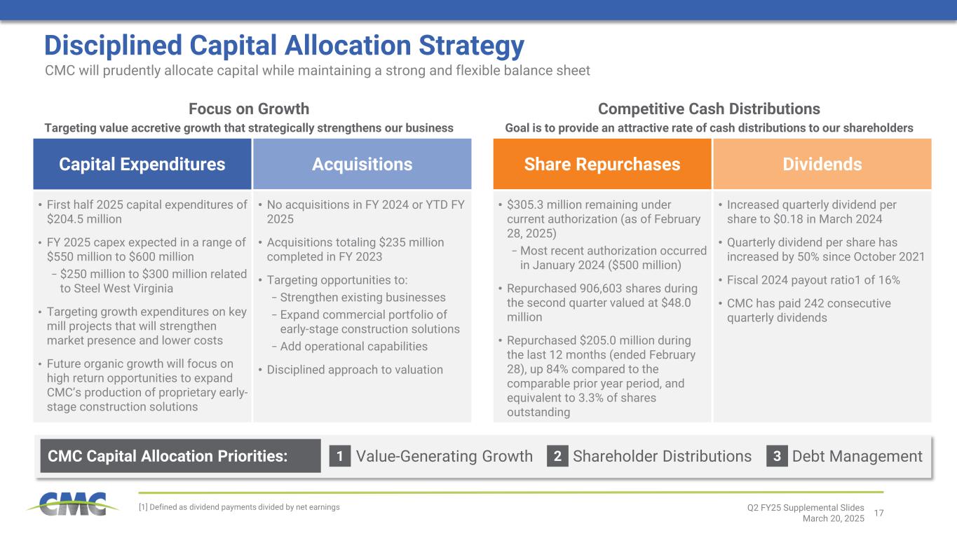 16 156 159 1.8% 0.2% (2.9%) 4.3% (1.5%) 100 110 120 130 140 150 160 170 Q2 2024 Geogrids & Geopiers Construction Services Impact Metals Performance Reinforcing Steel Anchoring Systems Q2 2025 Key Performance Drivers Q2 2025 vs Q2 2024 Q2 Emerging Businesses Group Q2 ’24 Q3 ’24 Q4 ’24 Q1 ’25 Q2 ’25 Net sales to external customers $155,994 $188,593 $195,571 $169,415 $158,864 Adjusted EBITDA $17,929 $38,220 $42,519 $22,660 $23,519 Adjusted EBITDA Margin 11.5% 20.3% 21.7% 13.4% 14.8% Performance Summary Units in 000’s except margin • Strong financial results within Performance Reinforcing Steel on robust project shipments and higher margin sales mix • Profitability of Tensar division was largely unchanged compared to the prior year period; project pipeline remains healthy • Impact Metals results were modestly lower y/y on weaker truck and trailer demand, however, both sales and profitability increased sequentially from a weak first quarter • Healthy activity levels and stable performance within CMC Construction Services division Contribution to Net Sales Change – Q2 2024 to Q2 2025 Quarterly net sales figures in $ million, contribution to net sales changes provided in percentages Q2 FY25 Supplemental Slides March 20, 2025 Q ua rt er ly n et s al es in $ m ill io n; ne t s al es c ha ng es in p er ce nt ag es Net sales up 1.8% Directional Change in Underlying Margin Performance