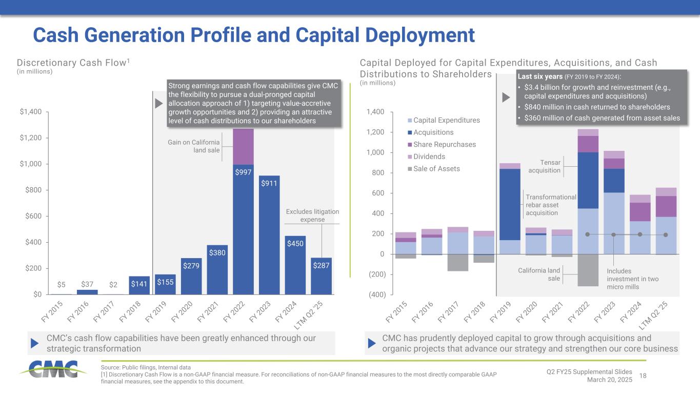 17 • First half 2025 capital expenditures of $204.5 million • FY 2025 capex expected in a range of $550 million to $600 million − $250 million to $300 million related to Steel West Virginia • Targeting growth expenditures on key mill projects that will strengthen market presence and lower costs • Future organic growth will focus on high return opportunities to expand CMC’s production of proprietary early- stage construction solutions Disciplined Capital Allocation Strategy CMC will prudently allocate capital while maintaining a strong and flexible balance sheet Q2 FY25 Supplemental Slides March 20, 2025 [1] Defined as dividend payments divided by net earnings 2 31 Value-Generating Growth Shareholder Distributions Debt ManagementCMC Capital Allocation Priorities: Capital Expenditures Acquisitions Share Repurchases Dividends • No acquisitions in FY 2024 or YTD FY 2025 • Acquisitions totaling $235 million completed in FY 2023 • Targeting opportunities to: − Strengthen existing businesses − Expand commercial portfolio of early-stage construction solutions − Add operational capabilities • Disciplined approach to valuation • $305.3 million remaining under current authorization (as of February 28, 2025) − Most recent authorization occurred in January 2024 ($500 million) • Repurchased 906,603 shares during the second quarter valued at $48.0 million • Repurchased $205.0 million during the last 12 months (ended February 28), up 84% compared to the comparable prior year period, and equivalent to 3.3% of shares outstanding • Increased quarterly dividend per share to $0.18 in March 2024 • Quarterly dividend per share has increased by 50% since October 2021 • Fiscal 2024 payout ratio1 of 16% • CMC has paid 242 consecutive quarterly dividends Focus on Growth Targeting value accretive growth that strategically strengthens our business Competitive Cash Distributions Goal is to provide an attractive rate of cash distributions to our shareholders