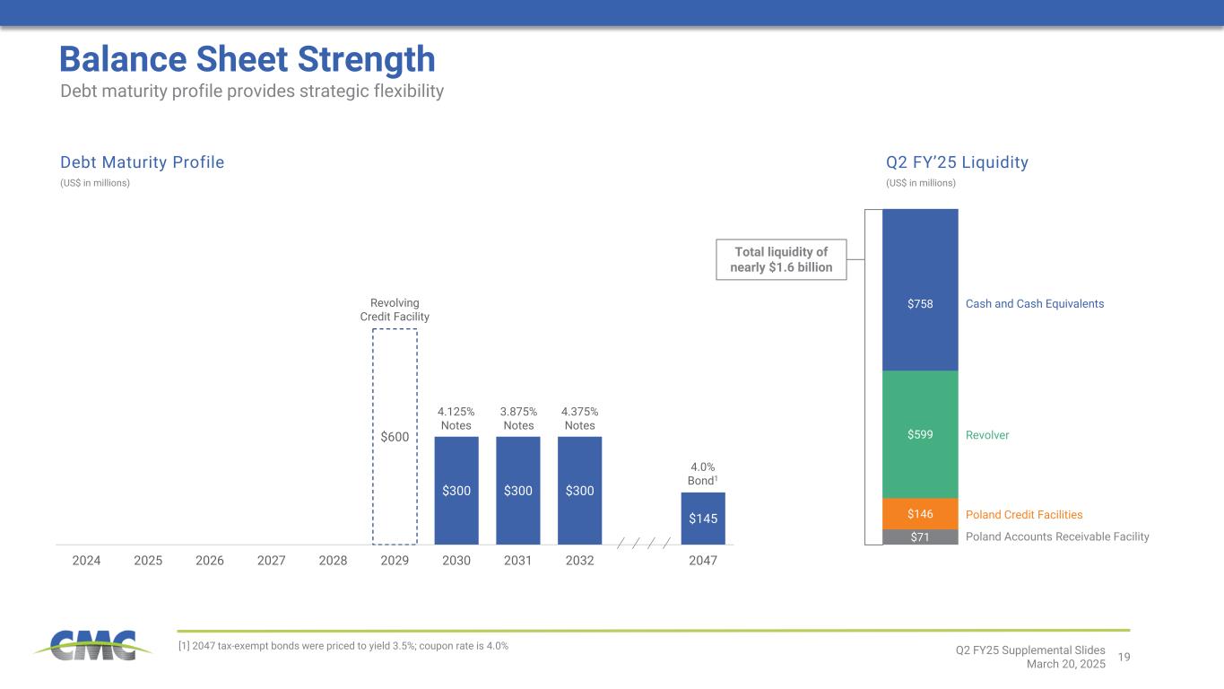 18 Discretionary Cash Flow1 (in millions) Capital Deployed for Capital Expenditures, Acquisitions, and Cash Distributions to Shareholders (in millions) $5 $37 $2 $141 $155 $279 $380 $997 $911 $450 $287 $0 $200 $400 $600 $800 $1,000 $1,200 $1,400 Excludes litigation expense Cash Generation Profile and Capital Deployment Source: Public filings, Internal data [1] Discretionary Cash Flow is a non-GAAP financial measure. For reconciliations of non-GAAP financial measures to the most directly comparable GAAP financial measures, see the appendix to this document. CMC’s cash flow capabilities have been greatly enhanced through our strategic transformation Gain on California land sale Q2 FY25 Supplemental Slides March 20, 2025 Last six years (FY 2019 to FY 2024): • $3.4 billion for growth and reinvestment (e.g., capital expenditures and acquisitions) • $840 million in cash returned to shareholders • $360 million of cash generated from asset sales CMC has prudently deployed capital to grow through acquisitions and organic projects that advance our strategy and strengthen our core business Transformational rebar asset acquisition Tensar acquisition Includes investment in two micro mills California land sale Strong earnings and cash flow capabilities give CMC the flexibility to pursue a dual-pronged capital allocation approach of 1) targeting value-accretive growth opportunities and 2) providing an attractive level of cash distributions to our shareholders (400) (200) 0 200 400 600 800 1,000 1,200 1,400 Capital Expenditures Acquisitions Share Repurchases Dividends Sale of Assets