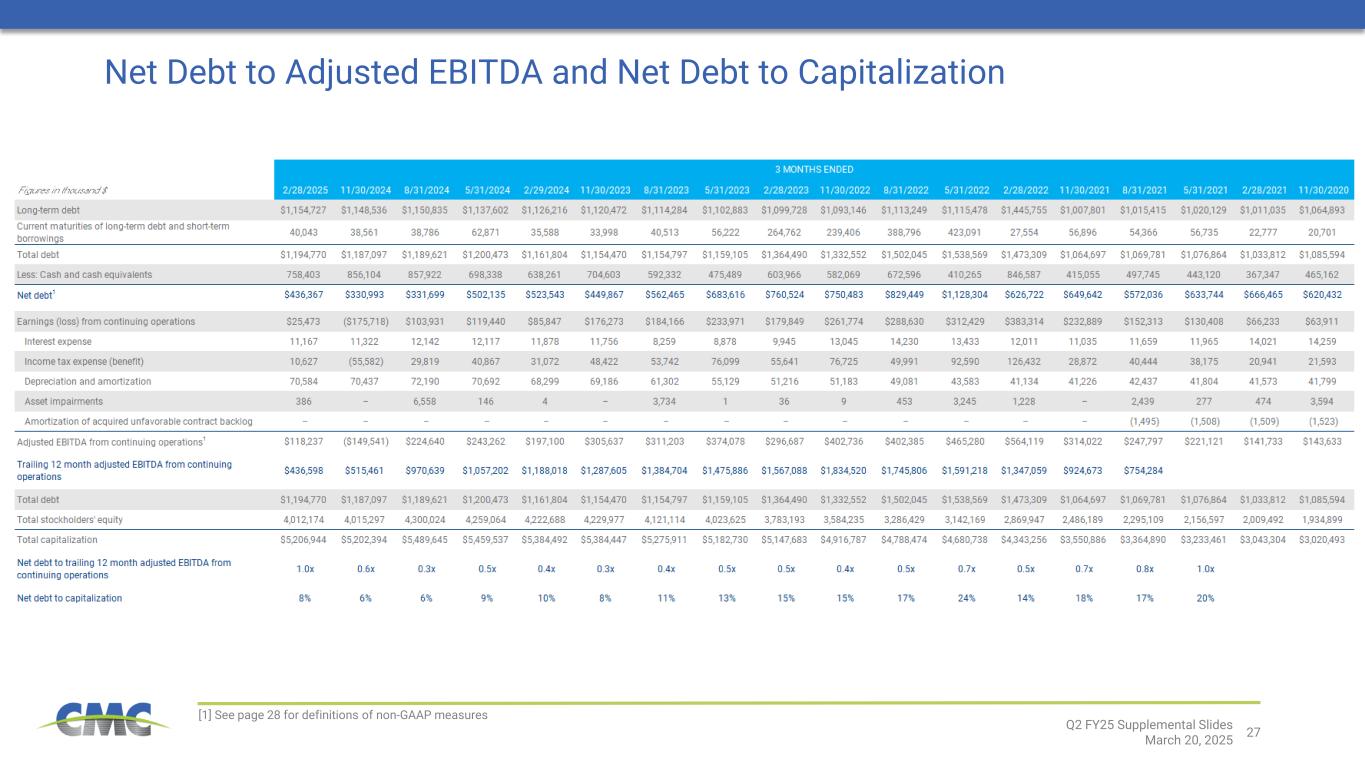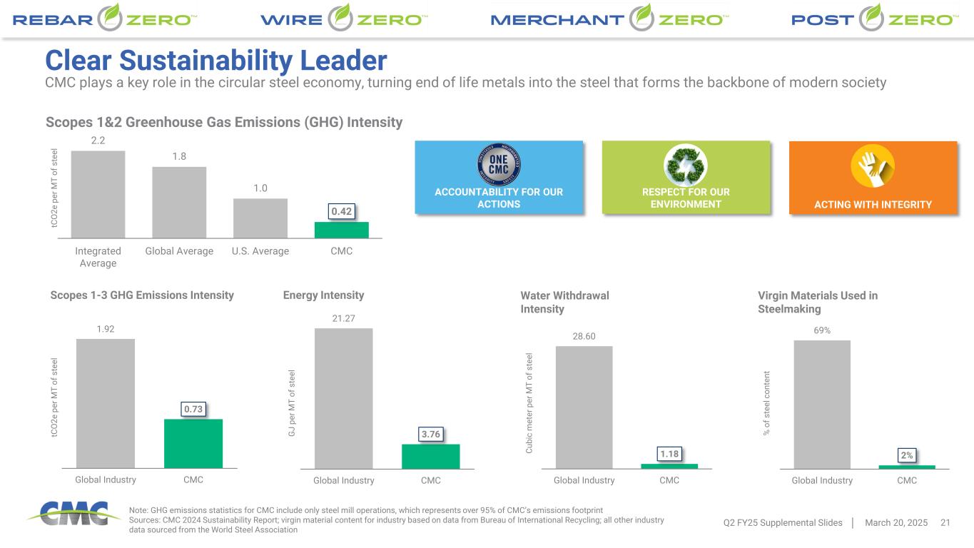 20 45 % 46 % 42 % 37 % 33 % 32 % 24 % 18 % 21 % 22 % 20 % 17 % 18 % 14 % 24 % 17 % 15 % 15 % 13 % 11 % 8% 10 % 9% 6% 6% 8% 0% 5% 10% 15% 20% 25% 30% 35% 40% 45% 50% 3. 8x 3. 9x 3. 2x 2. 5x 1. 9x 1. 6x 1. 2x 0. 9x 1. 1x 1. 2x 1. 0x 0. 8x 0. 7x 0. 5x 0. 7x 0. 5x 0. 4x 0. 5x 0. 5x 0. 4x 0. 3x 0. 4x 0. 5x 0. 3x 0. 6x 1. 0x NM 0.5x 1.0x 1.5x 2.0x 2.5x 3.0x 3.5x 4.0x 4.5x Source: Public filings, Internal data Notes: 1. Total debt is defined as long-term debt plus current maturities of long-term debt and short-term borrowings. 2. Net Debt is defined as total debt less cash & cash equivalents. 3. EBITDA depicted is adjusted EBITDA from continuing operations on a trailing 12-month basis 4. Net debt-to-capitalization is defined as net debt on CMC’s balance sheet divided by the sum of total debt and stockholders’ equity. For a reconciliation of non-GAAP financial measures to the most directly comparable GAAP financial measures, see the appendix to this document. Leverage Profile Financial strength gives us the flexibility to fund our announced projects, pursue opportunistic M&A, and distribute cash to shareholders Net Debt1,2 / EBITDA3 Net Debt-to-Capitalization4 Transformational rebar asset acquisition Tensar acquisition Construction of Arizona 2 Transformational rebar asset acquisition Tensar acquisition Construction of Arizona 2 Q2 FY25 Supplemental Slides March 20, 2025